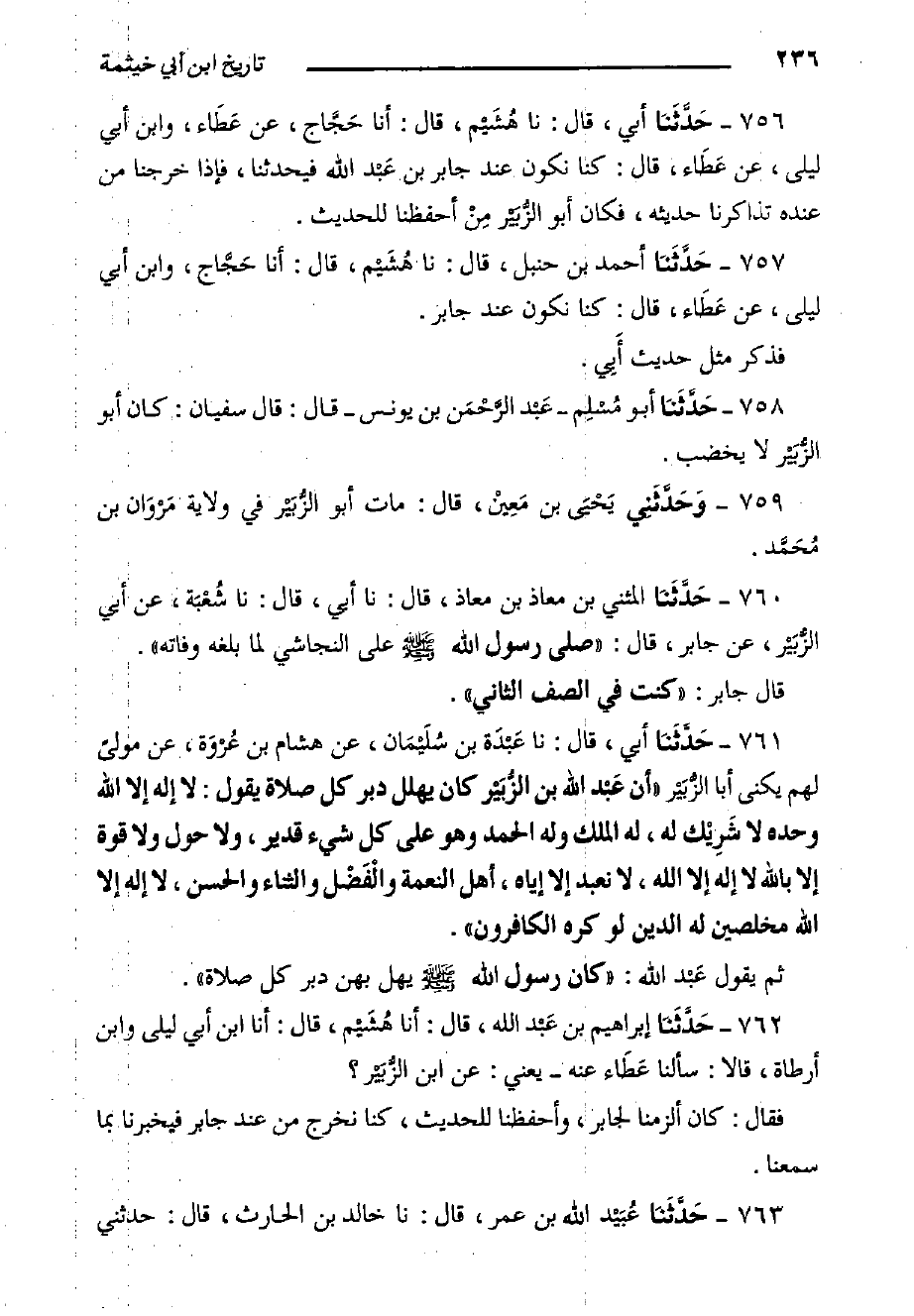 761- حَدَّثَنا أبي, قال: حدثنا عَبْدَة بْنُ سُلَيْمَان، عَنْ هِشَامِ بْنِ عُرْوَة، عَنْ مَوْلًى لَهُمْ يُكَنَّى أَبَا الزُّبَيْر "أَنَّ عَبْد اللَّهِ بْنَ الزُّبَيْر كَانَ يُهَلِّلُ دُبَرَ كُلِّ صَلاةٍ يَقُولُ: لا إِلَهَ إِلا اللَّهُ وَحْدَهُ لا شَرِيْك لَهُ، لَهُ الْمُلْكُ وَلَهُ الْحَمْدُ وَهُوَ عَلَى كُلِّ شَيْءٍ قَدِيرٌ، وَلا حَوْلَ وَلا قُوَّةَ إِلا بِاللَّهِ لا إِلَهَ إِلا اللَّهُ, لا نَعْبُدُ إِلا إِيَّاهُ, أهل النعمة والْفَضْل والثناء والحسن، لا إِلَهَ إِلا اللَّهُ مُخْلِصِينَ لَهُ الدِّينَ لَوْ كَرِهَ الْكَافِرُونَ، ثُمَّ يَقُولُ عَبْد اللَّهِ: "كَانَ رَسُولَ اللَّهِ صَلَّى اللَّهُ عَلَيْهِ وَسَلَّمَ يُهِلُّ بِهِنَّ دُبَرَ كُلِّ صَلاةٍ.