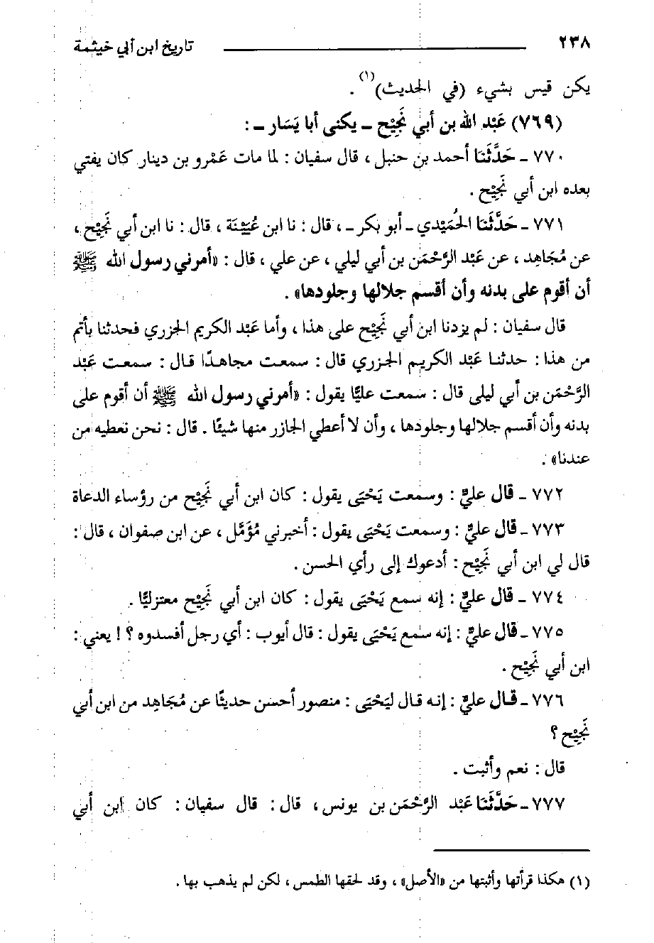773 - قَالَ عليٌّ: وسمعت يَحْيَى يَقُولُ: أَخْبَرَنِي مُؤَمَّل، عَنِ ابن صفوان, قَالَ: قَالَ لي ابن أبي نَجِيْح: أدعوك إِلَى رأي الحسن.