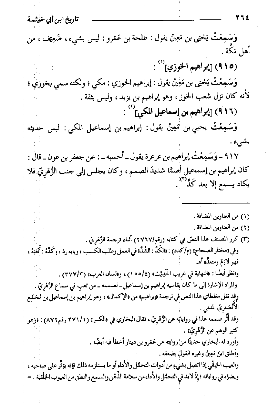 917 - وَسَمِعْتُ إِبْرَاهِيم بْن عرعرة يَقُولُ - أحسبه: عَنْ جَعْفَر بْن عون - قَالَ: كَانَ إِبْرَاهِيم بْن إِسْمَاعِيلَ أصما شديدَ الصمم, وكان يجلس إِلَى جنب الزُّهْرِيّ فلا يكاد يسمع إِلا بعد كَدٍّ