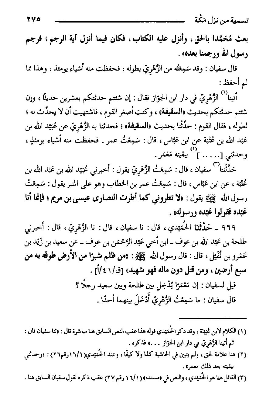 969- حَدَّثَنا الحُمَيْدي, قَالَ: حدثنا سفيان, قال: حدثنا الزُّهْرِيّ, قَالَ: أَخْبَرَنِي طَلْحَةُ بْنُ عَبْد اللَّهِ بْنِ عَوْفٍ - ابْنِ أَخِي عَبْد الرَّحْمَن بْنِ عَوْفٍ - عَنْ سَعِيدِ بْنِ زَيْد بْنِ عَمْرو بْنِ نُفَيْل, قَالَ: قَالَ رَسُولَ اللَّهِ صَلَّى اللَّهُ عَلَيْهِ وَسَلَّمَ: مَنْ ظَلَمَ شِبْرًا مِنَ الأَرْضِ طُوِّقَهُ بِهِ مِنْ سَبْعِ أَرْضِينَ، وَمَنْ قُتِلَ دُونَ مَالِهِ فهو شهيد" [ق/41/أ] .