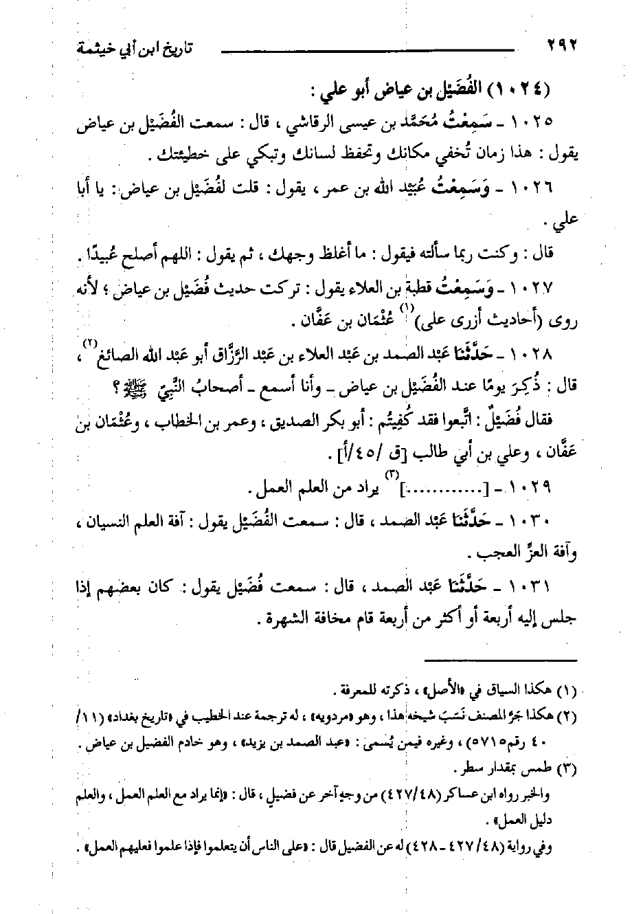 1028- حَدَّثَنا عَبْد الصمد بْن عَبْد العلاء بْن عَبْد الرَّزَّاق أَبُو عَبْد اللَّهِ الصائغ , قَالَ: ذُكِرَ يوما عند الفُضَيْل بْن عياض - وأنا أسمع - أصحابُ النَّبِيّ صَلَّى اللَّهُ عَلَيْهِ وَسَلَّمَ؟ فَقَالَ فُضَيْلٌ: اتَّبعوا فقد كُفِيتُم: أَبُو بَكْرٍ الصديق, وعمر بْن الخطاب, وعُثْمَان بْن عَفَّان، وعلي بْن أبي طالب ق /45/أ] .