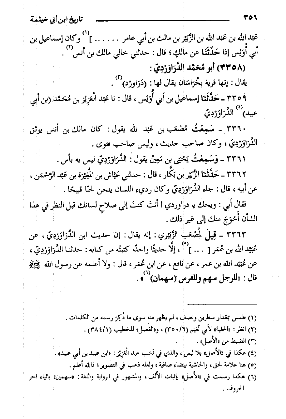 3360- سَمِعْتُ مُصْعَب بن عَبْد الله يقول: كان مالك بن أنس يوثق الدَّرَاوَرْدِيّ، وكان صاحب حديث، وليس صاحب فتوى.