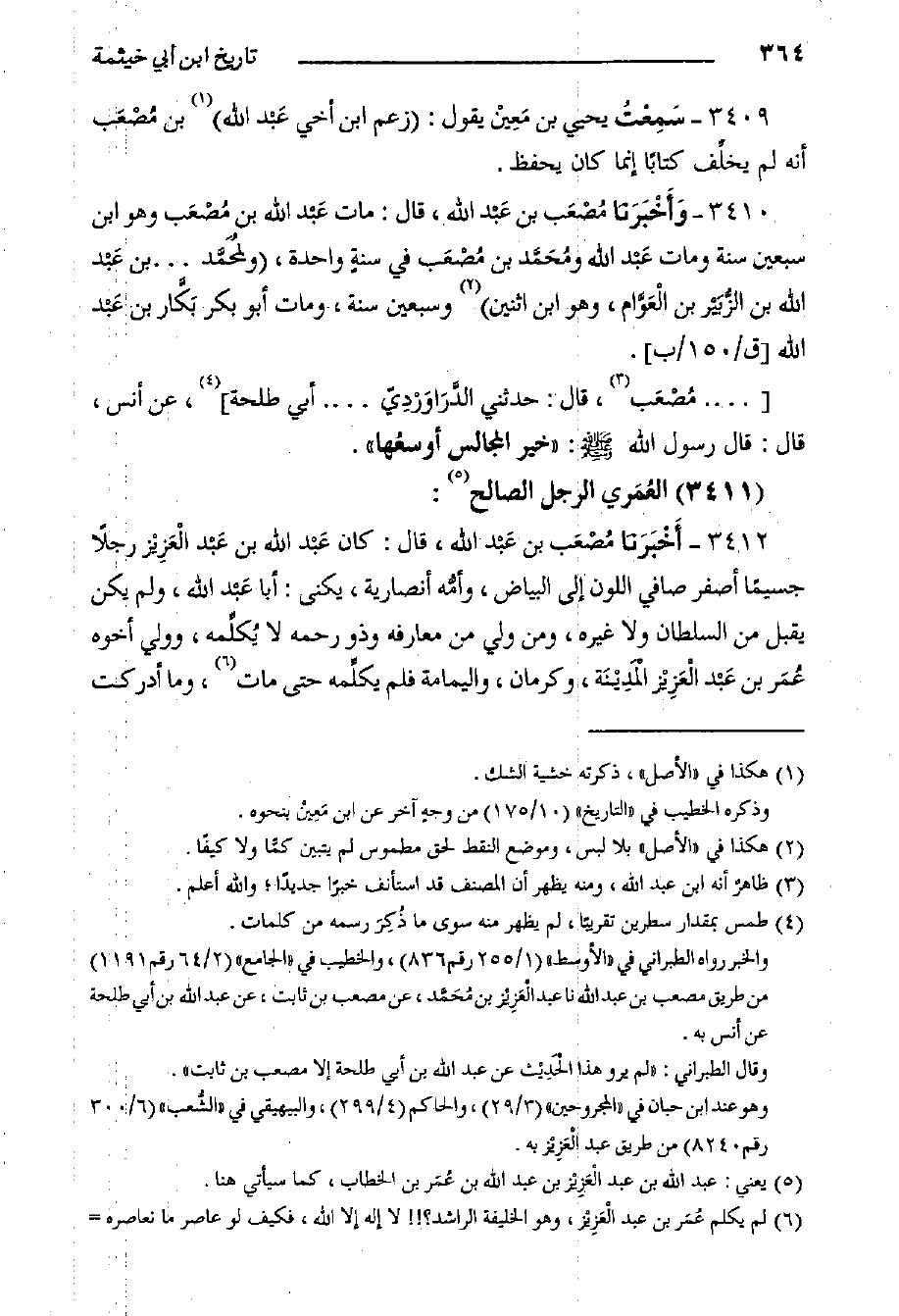 3409- سَمِعْتُ يَحْيَى بْن مَعِيْن يَقُولُ: زعم ابن أخي عَبْد الله بن مُصْعَب أنه لم يخلِّف كتابا إنما كان يحفظ.