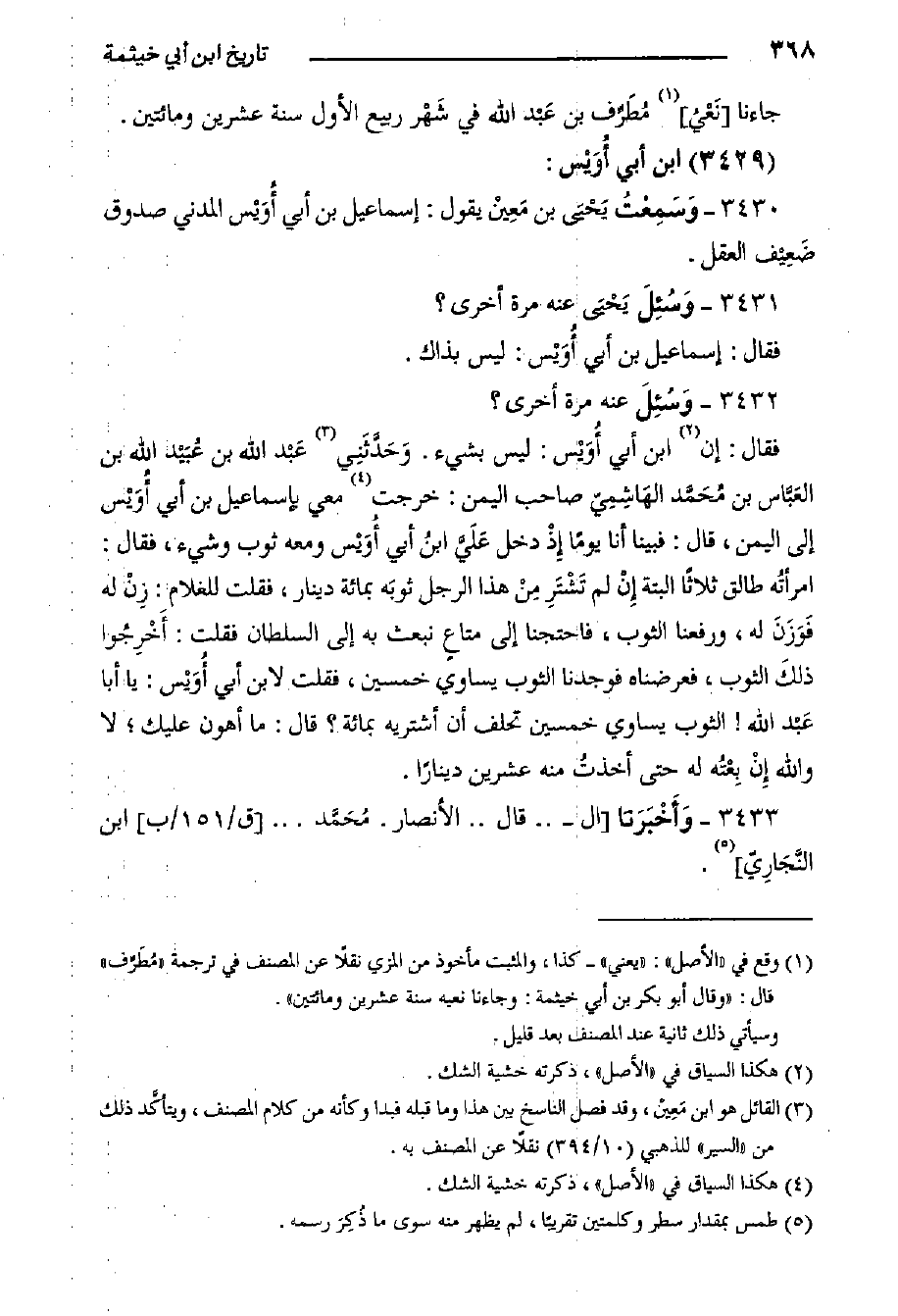 3432- وَسُئِلَ عنه مرة أخرى؟ فقال: إن ابن أبي أُوَيْس: ليس بشيء. وَحَدَّثَنِي عَبْد الله بن عُبَيْد الله بن العَبَّاس بن مُحَمَّد الهَاشِمِيّ صاحب اليمن: خرجت معي بإسماعيل بن أبي أُوَيْس إِلَى اليمن، قَالَ: فبينا أنا يوما إِذْ دخل عَلَيَّ ابنُ أبي أُوَيْس ومعه ثوب وشيء، فقال: امرأتُه طالق ثلاثا البتة إِنْ لم تَشْتَرِ مِنْ هذا الرجل ثوبَه بمئة دينار، فقلت للغلام: زِنْ له فَوَزَنَ له، ورفعنا الثوب، فاحتجنا إِلَى متاعٍ نبعث به إِلَى السلطان فقلت: أَخْرِجُوا ذلكَ الثوب، فعرضناه فوجدنا الثوب يساوي خمسين، فقلت لابن أبي أُوَيْس: يا أبا عَبْد الله! الثوب يساوي خمسين تحلف أن أشتريه بمئة؟ قَالَ: ما أهون عليك؛ لا والله إِنْ بِعْتُه له حتى أخذتُ منه عشرين دينارا.