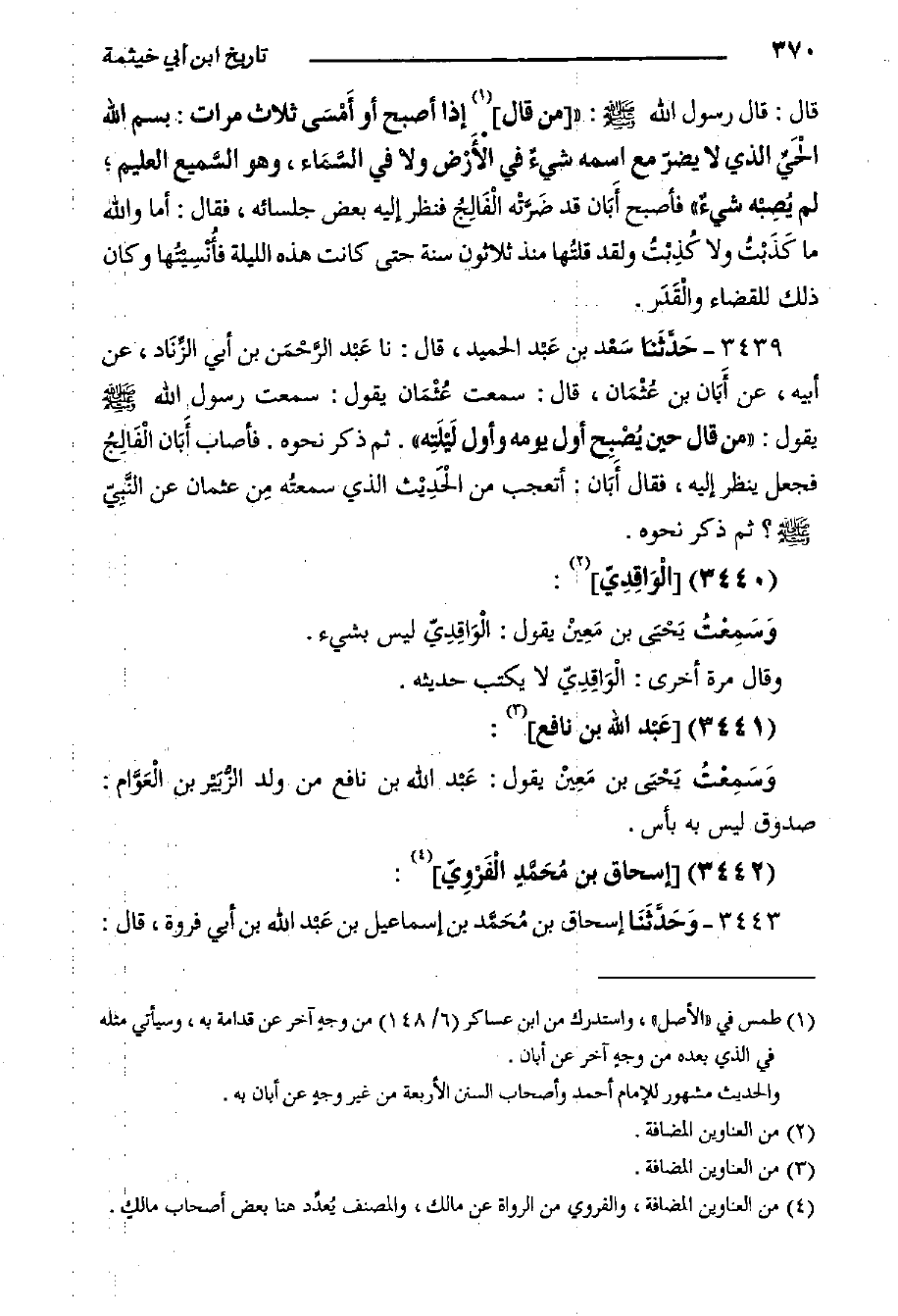 3439- حَدَّثَنا سَعْد بْن عَبْد الحميد، قال: حدثنا عَبْد الرَّحْمَن بْنُ أَبِي الزِّنَاد، عَنْ أَبِيهِ، عَنْ أَبَان بْنِ عُثْمَان، قَالَ: سمعت عُثْمَان يقول: سَمِعْتُ رَسُولَ اللَّهِ صَلَّى اللَّهُ عَلَيْهِ وَسَلَّمَ يَقُولُ: "مَنْ قَالَ حِينَ يُصْبِح أَوَّلَ يَوْمِهِ وَأَوَّلَ لَيْلَتِه. ثُمَّ ذَكَرَ نَحْوَهُ. فَأَصَابَ أَبَان الْفَالِجُ فَجَعَلَ يَنْظُرُ إِلَيْهِ، فَقَالَ أَبَان: أَتَعْجَبُ مِنْ الْحَدِيْث الَّذِي سمعتُه مِن عُثْمَانَ عَنِ النَّبِيّ صَلَّى اللَّهُ عَلَيْهِ وَسَلَّمَ؟ ثُمَّ ذَكَرَ نَحْوَهُ.