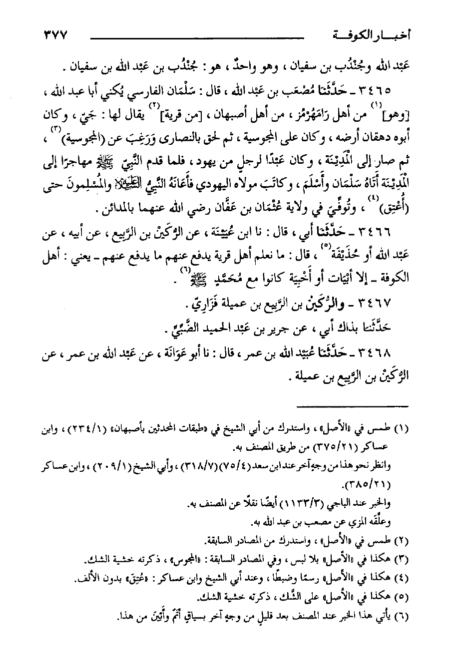 3465- حَدَّثَنا مُصْعَب بْن عَبْد اللَّه، قَالَ: سَلْمَان الفارسي يُكني أبا عبد الله، وهو من أهل رَامَهُرْمُز، من أهل أصبهان، من قرية يقال لها: جَيّ، وكان أبوه دهقان أرضه، وكان على المجوسية، ثم لحق بالنصارى وَرَغِبَ عن المجوسية، ثم صار إِلَى الْمَدِيْنَة، وكان عَبْدًا لرجلٍ من يهود، فلما قدم النَّبِيّ صَلَّى اللَّهُ عَلَيْهِ وَسَلَّمَ مهاجرا إِلَى الْمَدِيْنَة أَتَاهُ سَلْمَان وأَسْلَمَ، وكاتَبَ مولاه اليهودي فأَعَانَهُ النَّبِيُّ عَلَيْهِ السلام والمُسْلِمونَ حتى (أُعْتِق، وتُوفِّيَ في ولاية عُثْمَان بن عَفَّان رَضِيَ اللَّهُ عَنْهُما بالمدائن.