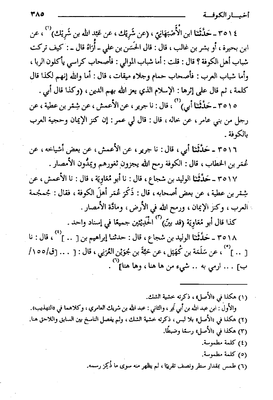 3517- حَدَّثَنا الْوَلِيدُ بن شجاع، قال: حدثنا أبو مُعَاوِيَة، قال: حدثنا الأَعْمَشِ، عَنْ شِمْر بْنِ عَطِيَّةَ، عَنْ بَعْضِ أَصْحَابِهِ، قَالَ: ذَكَرَ عُمَر أهلَ الْكُوفَةِ، فَقَالَ: جُمجُمة الْعَرَبِ، وَكَنْزُ الإِيمَانِ، وَرُمْحُ اللَّهِ فِي الأَرْضِ، ومادَّة الأَمْصَارِ.