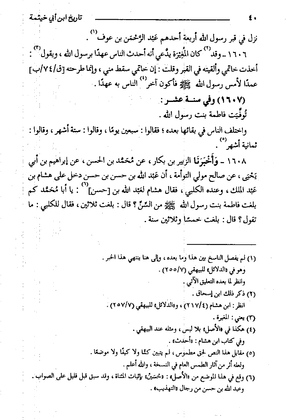 1608- وَأَخْبَرَنَا الزُّبَيْرُ بْنُ بَكَّارٍ، عَنْ مُحَمَّد بْن الحسن، عَنْ إِبْرَاهِيم بْن أَبِي يَحْيَى، عَنْ صَالِحٍ مَوْلَى التوأمة، أَنَّ عَبْد اللَّهِ بْنَ حَسَنِ بْنِ حَسَنٍ دَخَلَ عَلَى هِشَامُ بْنُ عَبْد الْمَلِكِ، وَعِنْدَهُ الْكَلْبِيُّ، فَقَالَ هِشَامُ لعَبْد اللَّهِ بْنِ حَسَنٍ: يَا أَبَا مُحَمَّد كَمْ بَلَغَتْ فَاطِمَةُ بِنْتُ رَسُولِ اللَّهِ صَلَّى اللَّهُ عَلَيْهِ وَسَلَّمَ من السِّنِّ؟ قَالَ: بَلَغَتْ ثَلاثِينَ، فَقَالَ لِلْكَلْبِيِّ: مَا تَقُولُ؟ قَالَ: بَلَغَتْ خَمْسًا وَثَلاثِينَ سَنَةً