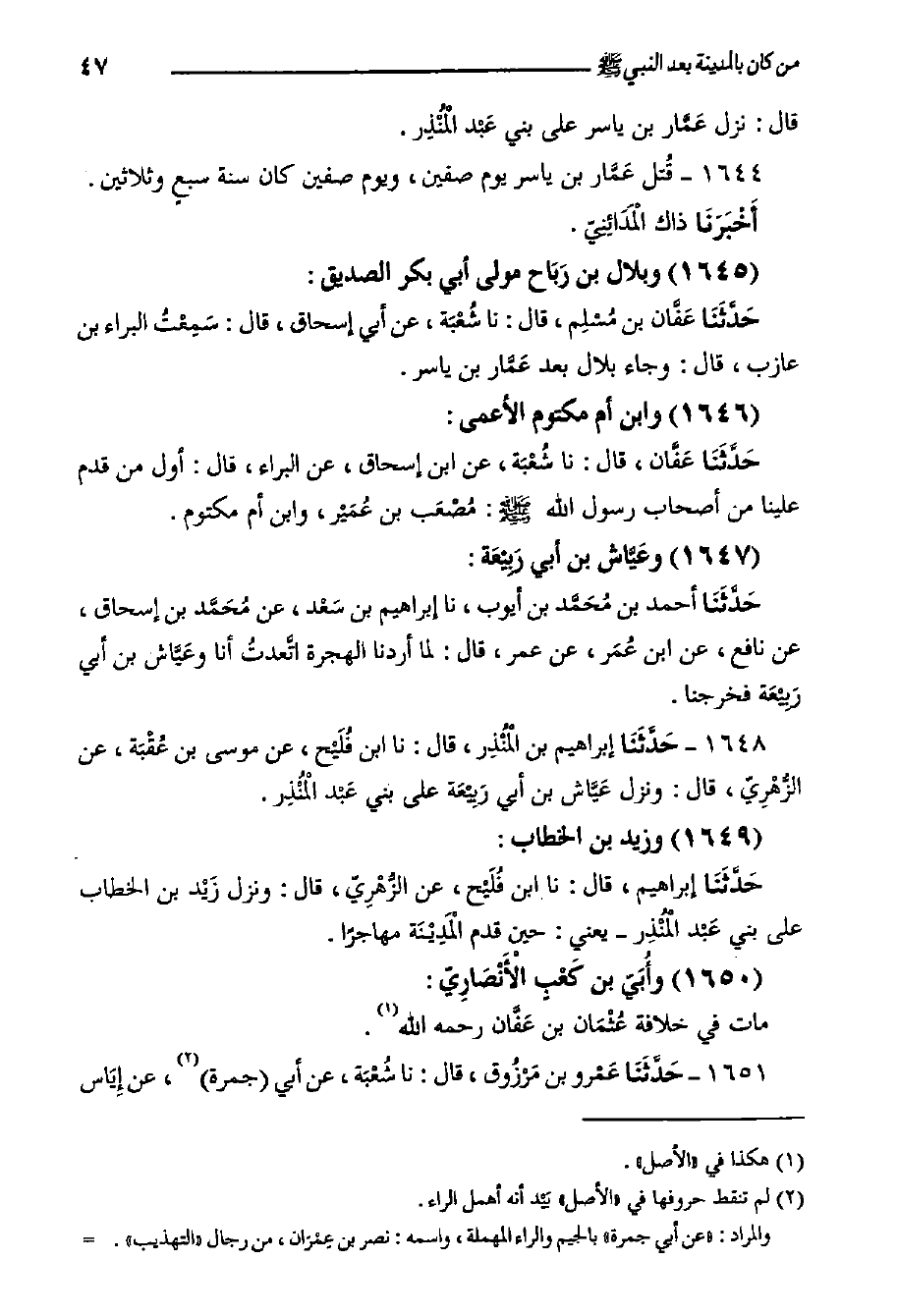 1648 - حَدَّثَنَا إِبْرَاهِيمُ بْنُ الْمُنْذِر، قَالَ: حدثنا ابْنِ فُلَيْح، عَنْ مُوسَى بْنِ عُقْبَة، عَنِ الزُّهْرِيّ، قَالَ: وَنَزَلَ عَيَّاش بْنُ أَبِي رَبِيْعَة عَلَى بَنِي عَبْد الْمُنْذِر.
