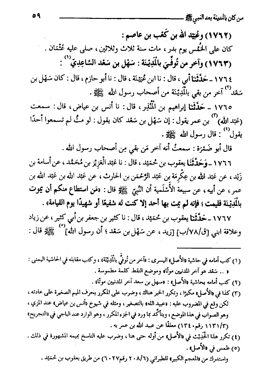 1766- وَحَدَّثَنَا يَعْقُوبُ بْنُ حُمَيْد، قَالَ: حدثنا عَبْد الْعَزِيْز بْنُ مُحَمَّد، عَنْ أُسَامَةَ بْنِ زَيْد، عَنْ عَبْد اللَّهِ بْنِ عِكْرِمَة بْنِ عَبْد الرَّحْمَن بْنِ الْحَارِثِ، عَنْ عَبْد الله بن عَبْد الله بن عُمَرَ، عَنْ أَبِيهِ، عَنْ سَبِيعَةَ الأَسْلَمية أَنّ النَّبِيّ صَلَّى اللَّهُ عَلَيْهِ وَسَلَّمَ قَالَ: مَن اسْتَطَاعَ مِنْكُمْ أَنْ يَمُوتَ بالْمَدِيْنَة فَلْيَمُتْ؛ فَإِنَّهُ لَمْ يَمُتْ بِهَا أَحَدٌ إِلا كُنْتُ لَهُ شَفِيعًا أَوْ شَهِيدًا يَوْمَ الْقِيَامَةِ.