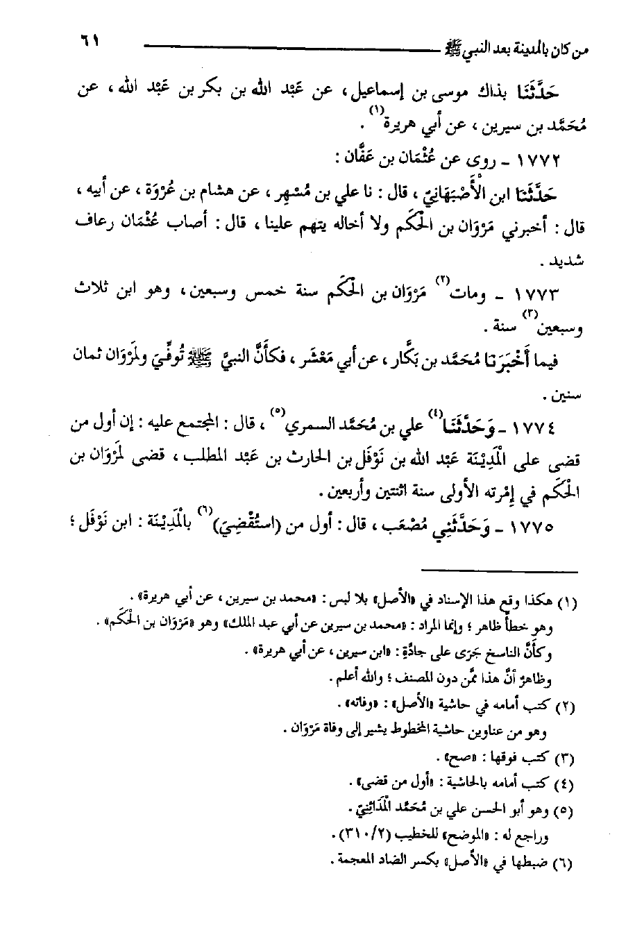 1774- وَحَدَّثَنَا علي بن مُحَمَّد السمري، قَالَ: المجتمع عَلَيْهِ: إن أول من قضى على الْمَدِيْنَة عَبْد الله بن نَوْفَل بن الحارث بن عَبْد المطلب، قضى لمَرْوَان بن الْحَكَم في إِمْرته الأولى سنة اثنتين وأربعين.