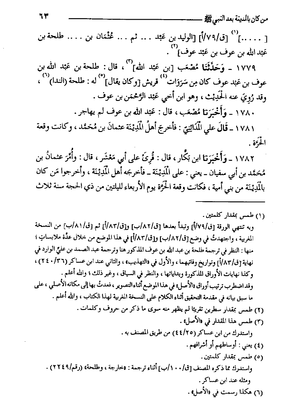 1781- قَالَ علي الْمَدَائِنِيّ: فأخرجَ أهلُ الْمَدِيْنَة عثمانَ بن مُحَمَّد، وكانت وقعة الْحَرَّة.