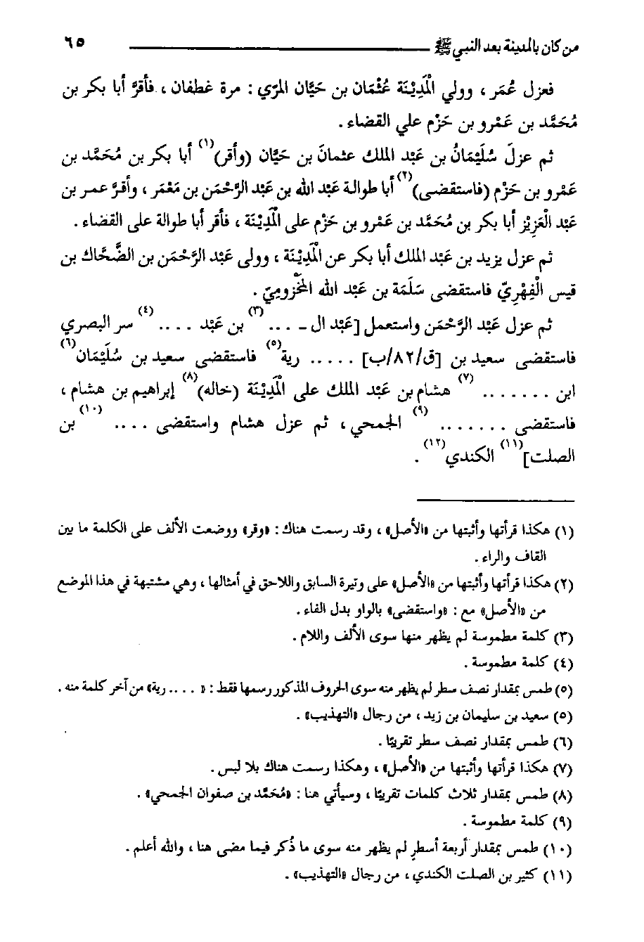 فعزل عُمَر، وولي الْمَدِيْنَة عُثْمَان بن حَيَّان المري: مرة غطفان، فأقرَّ أبا بكر بن مُحَمَّد بن عَمْرو بن حَزْم على القضاء، ثم عزلَ سُلَيْمَانُ بن عَبْد الملك عثمانَ بن حَيَّان وأقر أبا بكر بن مُحَمَّد بن عَمْرو بن حَزْم فاستقضى أبا طوالة عَبْد الله بن عَبْد الرَّحْمَن بن مَعْمَر، وأقرَّ عمر بن عَبْد الْعَزِيْز أبا بَكْرِ بْنِ مُحَمَّد بْنِ عَمْرو بن حَزْم على الْمَدِيْنَة، فأقر أبا طوالة على القضاء، ثم عزل يزيد بن عَبْد الملك أبا بكر عن الْمَدِيْنَة، وولي عَبْد الرَّحْمَن بن الضَّحَّاك بن قيس الْفِهْرِيّ فاستقضى سَلَمَة بن عَبْد الله المَخْزومِيّ، ثم عزل عَبْد الرَّحْمَن واستعمل عَبْد الـ ... بن عَبْد ... سر البصري فاستقضى سعيد بن [ق/82/ب] ... رية فاستقضى سعيد بن سُلَيْمَان بن ... . هشام بن عَبْد الملك على الْمَدِيْنَة خاله إبراهيم بن هشام، فاستقضي ... . الجمحي، ثم عزل هشام واستقضى ... بن الصلت الكندي