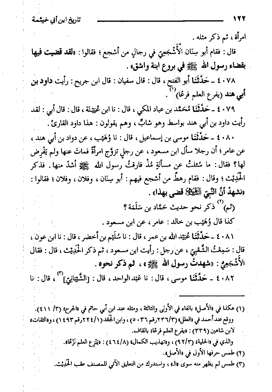 4080- حَدَّثَنَا موسى بن إسماعيل، قال: حدثنا وُهَيْب، عن دواد بْنِ أَبِي هِنْدٍ، عَنْ عَامِرٍ؛ أَنَّ رَجُلا سَأَلَ ابْنَ مَسْعُودٍ، عَنْ رجلٍ تزوَّج امْرَأَةً فماتَ عَنْهَا وَلَمْ يَفْرِض لَهَا؟ فَقَالَ: مَا سُئلتُ عَنْ مسألةٍ مُذْ فارقتُ رَسُولَ اللَّهِ صَلَّى اللَّهُ عَلَيْهِ وَسَلَّمَ أَشَدَّ مِنْهَا. فَذَكَرَ الْحَدِيْث؛ وَقَالَ: فَقَامَ رهطٌ مِنْ أَشْجَعَ فِيهِمْ: أَبُو سِنَان، وَفُلانٌ، وَفُلانٌ؛ فَقَالُوا: "نشهدُ أنَّ النَّبِيّ عَلَيْهِ السَّلامُ قَضَى بِهَذَا، ثُمَّ ذَكَرَ نَحْوَ حَدِيثِ حَمَّاد بْنِ سَلَمَة؟ كَذا قَالَ وُهَيْب بْن خَالِد: عَامِر، عَنِ ابْن مَسْعُود.