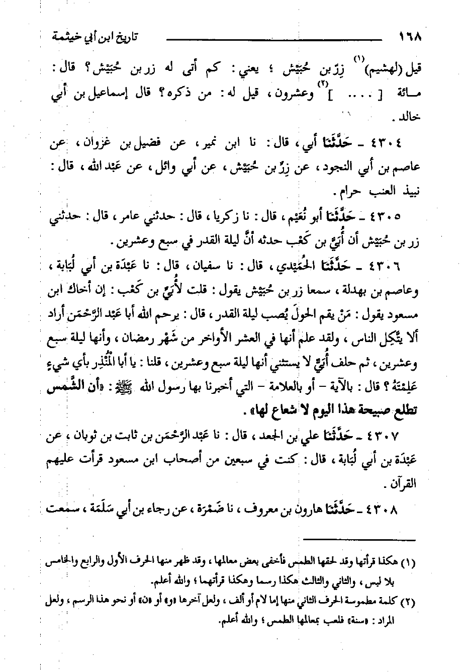 4306- حَدَّثَنا الحُمَيْدي، قال: حدثنا سفيان، قال: حدثنا عَبْدَة بْنُ أَبِي لُبَابَةَ، وَعَاصِمَ بْنَ بَهْدَلَةَ، سَمِعَا زِرَّ بْنَ حُبَيْش يَقُولُ: قُلْتُ لأُبَيِّ بْنِ كَعْب: إِنَّ أَخَاكَ ابْنَ مَسْعُودٍ يَقُولُ: مَنْ يَقُمِ الحولَ يُصب لَيْلَةَ الْقَدْرِ، قَالَ: يَرْحَمُ اللَّهُ أبا عَبْد الرَّحْمَن أرادا أَلا يَتَّكِلَ النَّاسُ وَلَقَدْ عَلِمَ أنها في العشر أواخر مِنْ شَهْر رَمَضَانَ، وَأَنَّهَا لَيْلَةُ سَبْعٍ وَعِشْرِينَ، ثُمَّ حَلَفَ أُبَيٌّ لا يَسْتَثْنِي أَنَّهَا لَيْلَةَ سَبْعٍ وَعِشْرِينَ، قُلْنَا: يَا أَبَا الْمُنْذِر بِأَيِّ شيءٍ عَلِمْتَهُ؟ قَالَ: بِالآيَةِ، أَوْ بِالْعَلامَةِ الَّتِي أَخْبَرَنَا بِهَا رَسُولَ اللَّهِ صَلَّى اللَّهُ عَلَيْهِ وَسَلَّمَ: أَنَّ الشَّمس تَطْلُعُ صَبِيحَةَ هَذَا الْيَوْمِ لا شُعَاعَ لَهَا.