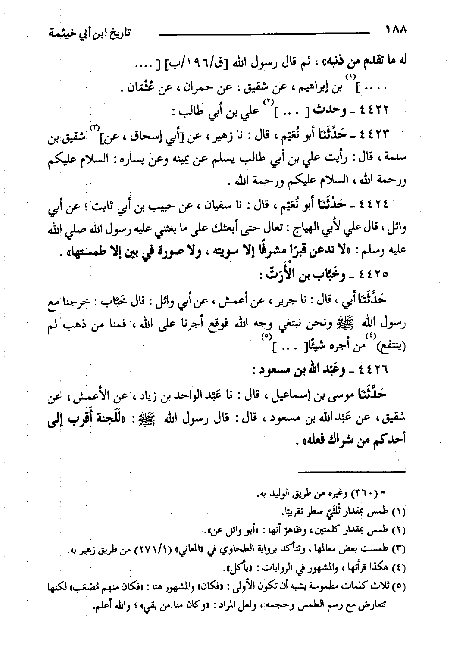 4424- حَدَّثَنا أَبُو نُعَيْم، قال: حدثنا سُفْيَانُ، عَنْ حَبِيبِ بْنِ أَبِي ثَابِتٍ؛ عَنْ أَبِي وَائِلٍ، قَالَ عَلِيٌّ لأَبِي الْهَيَّاجِ: تَعَالَ حَتَّى أَبْعَثَكَ عَلَى مَا بَعَثَنِي عَلَيْهِ رَسُولَ اللَّهِ صَلَّى اللَّهُ عَلَيْهِ وَسَلَّمَ: لا تَدَعَنَّ قَبْرًا مُشْرِفًا إِلا سَوَّيْتَهُ، وَلا صُورَةً فِي بين إِلا طَمَسْتَهَا.