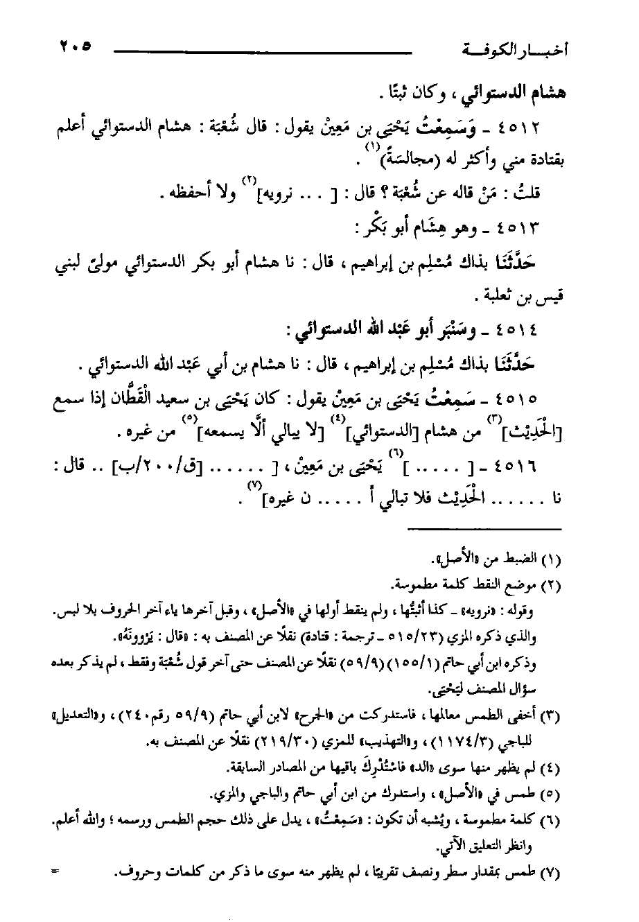 4512- وَسَمِعْتُ يَحْيَى بْن مَعِيْن يَقُولُ: قَالَ شُعْبَة: هشام الدستوائي أعلم بقتادة مني وأكثر لَهُ مجالسَةً.