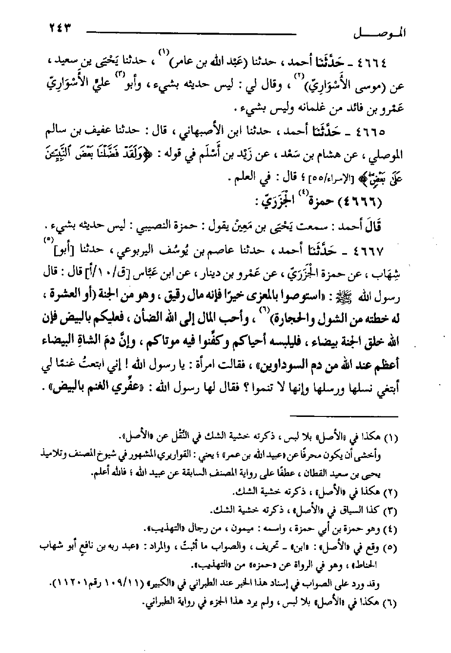 4667- حَدَّثَنا أَحْمَدُ، حَدَّثَنَا عَاصِمُ بْنُ يُوسُف الْيَرْبُوعِيُّ، حَدَّثَنَا أَبُو شِهَاب، عَنْ حَمْزَةَ الْجَزَرَيّ، عَنْ عَمْرو بْنِ دينار، عن ابن عَبَّاس [ق/10/أ] قَالَ: قَالَ رَسُولُ اللَّهِ صَلَّى اللَّهُ عَلَيْهِ وَسَلَّمَ: اسْتَوْصُوا بِالْمُعَزَّى خَيْرًا فَإِنَّهُ مَالٌ رَقِيقٌ، وَهُوَ مِنَ الْجَنَّةِ (أَوِ الْعَشْرَةِ، لَهُ خُطَّتُهُ مِنَ الشُّولِ وَالْحِجَارَةِ، وَأَحَبُّ الْمَالِ إِلَى اللَّهِ الضَّأْنُ، فَعَلَيْكُمْ بِالْبِيضِ فَإِنَّ اللَّه خَلَقَ الْجَنَّةَ بَيْضَاءَ، فَلْيَلْبَسْهُ أَحْيَاكُمْ وكفِّنوا فِيهِ مَوْتَاكُمْ، وإنَّ دمَ الشاةِ الْبَيْضَاءِ أَعْظَمُ عِنْدَ اللَّهِ مِنْ دَمِ السَّوْدَاوَيْنِ"، فَقَالَتِ امْرَأَةٌ: يَا رَسُولَ اللَّهِ! إِنِّي ابتعتُ غَنَمًا لِي أَبْتَغِي نَسْلَهَا وَرَسْلَهَا وَإِنَّهَا لا تنموا؟ فقال لها رسول الله: "عفِّري الْغَنَمَ بِالْبِيضِ