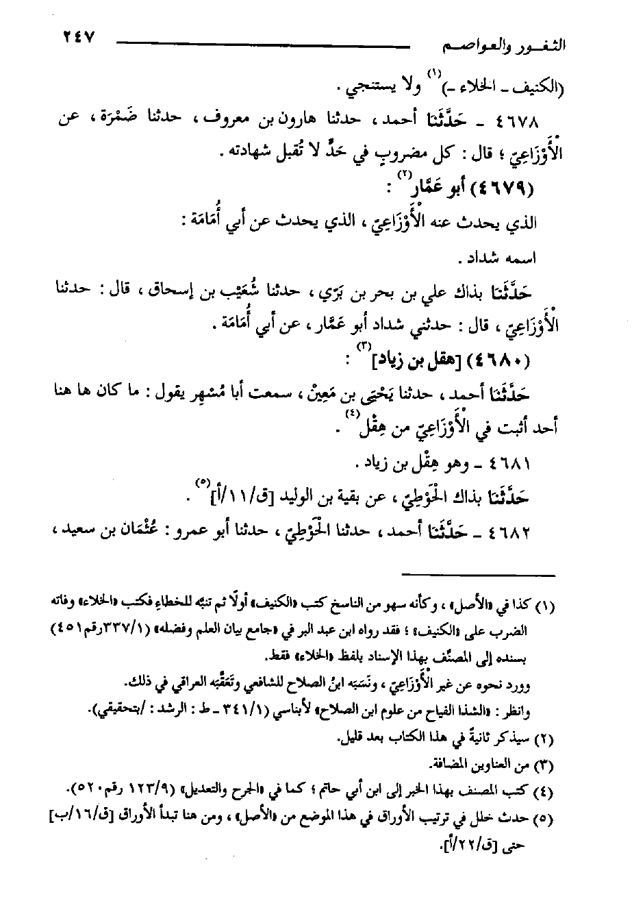 4678- حَدَّثَنا أَحْمَدُ، حَدَّثَنَا هارون بْن معروف، حَدَّثَنَا ضَمْرَة، عَنِ الأَوْزَاعِيّ؛ قَالَ: كل مضروبٍ فِي حَدٍّ لا تُقبل شهادته.