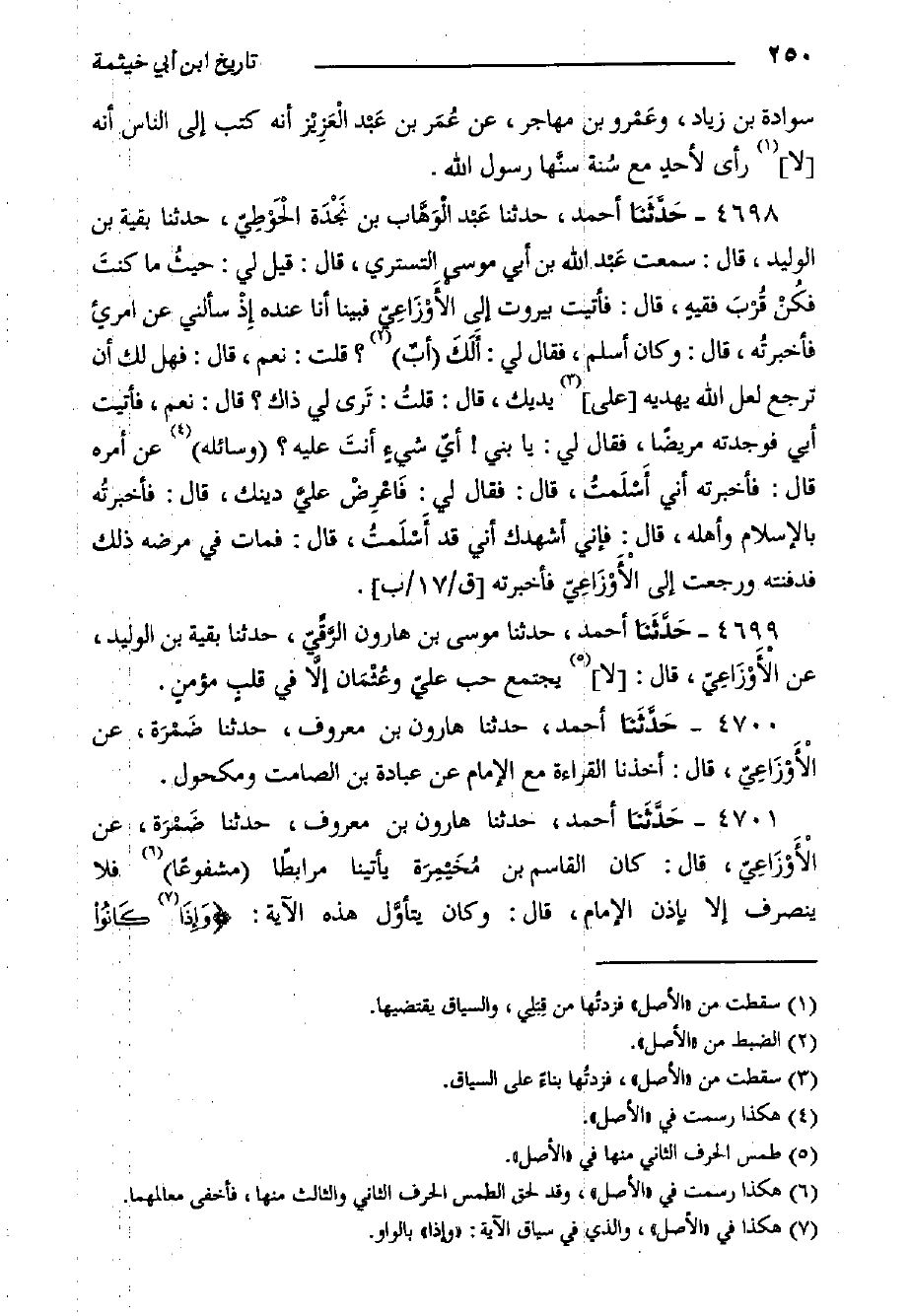 4700- حَدَّثَنا أَحْمَدُ، حَدَّثَنَا هارون بْن معروف، حَدَّثَنَا ضَمْرَة، عَنِ الأَوْزَاعِيّ، قَالَ: أخذنا القراءة مع الإمام عَنْ عبادة بْن الصامت ومكحول.