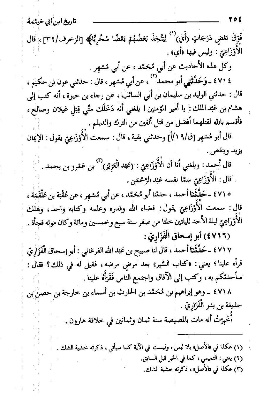 4717- حَدَّثَنا أحمد، قَالَ لنا صبيح بْن عَبْد اللَّهِ الفرغاني: أَبُو إسحاق الْفَزَارِيّ قرأه علينا؛ يعني: "كتاب السِّير" بعد مرضٍ مرضه، فقيل لَهُ فِي ذلك؟ فَقَالَ: سأحدثكم به، وكتب إِلَى الآفاق واجتمع الناس فَقَرَأَهُ علينا.