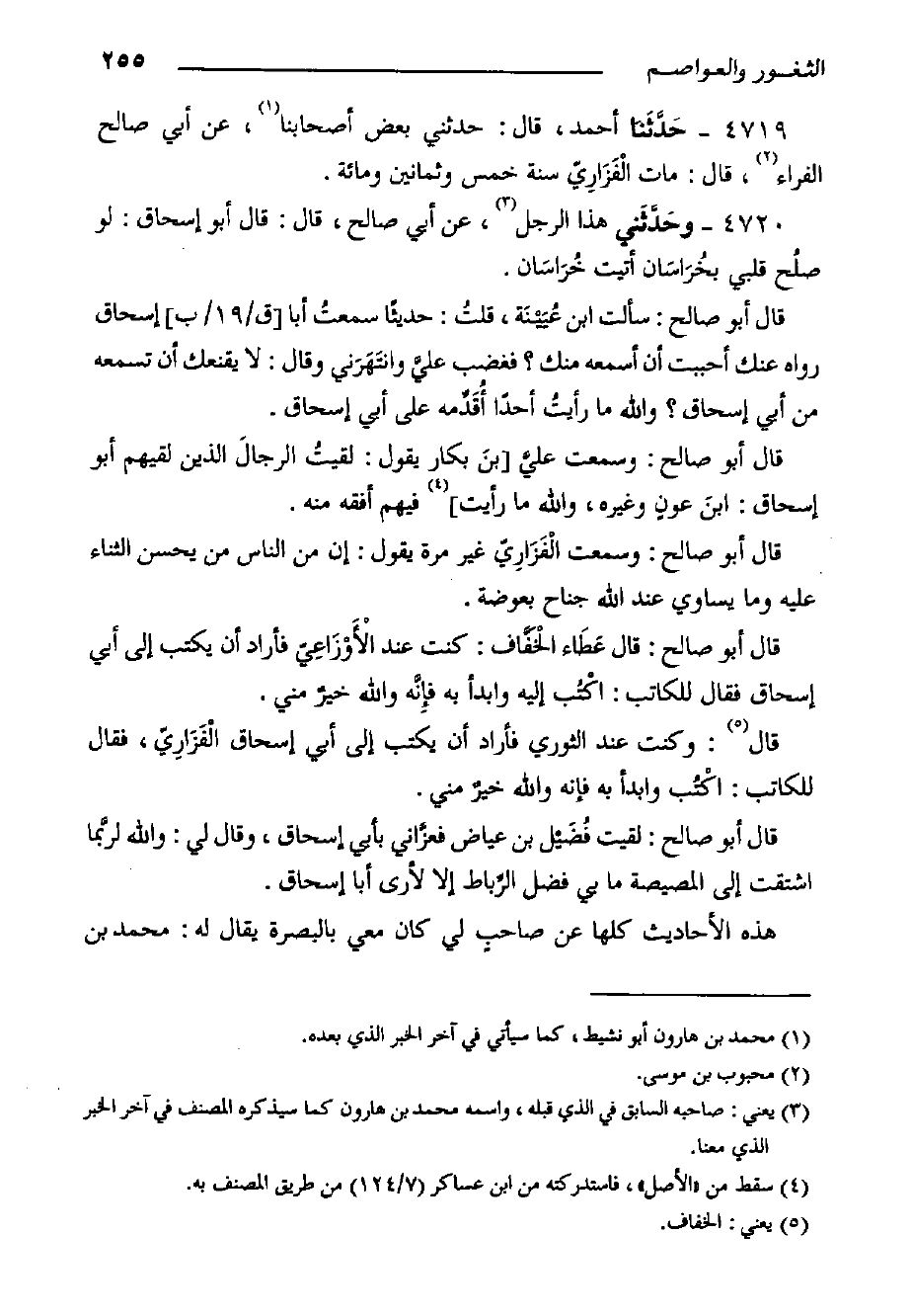 4719- حَدَّثَنا أَحْمَدُ، قَالَ: حَدَّثَنِي بعض أصحابنا، عَنْ أَبِي صالح الفراء، قَالَ: مات الْفَزَارِيّ سنة خمس وثمانين ومئة.