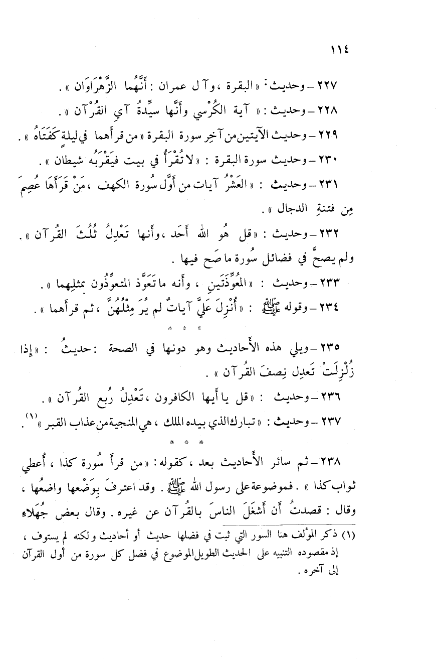 238- ثُمَّ سَائِرِ الأَحَادِيثِ بَعْدُ كَقَوْلِهِ: "مَنْ قَرَأَ سُورَةَ كَذَا أُعْطِيَ ثَوَابَ كَذَا" فَمَوْضُوعَةٌ عَلَى رَسُولِهِ صَلَّى اللَّهُ عَلَيْهِ وَسَلَّمَ وَقَدِ اعْتَرَفَ بِوَضْعِهَا وَاضِعُهَا وَقَالَ: "قَصَدْتُ أَنْ أَشْغِلَ النَّاسَ بِالْقُرْآنِ عَنْ غَيْرِهِ" وَقَالَ بَعْضُ جُهَلاءِ