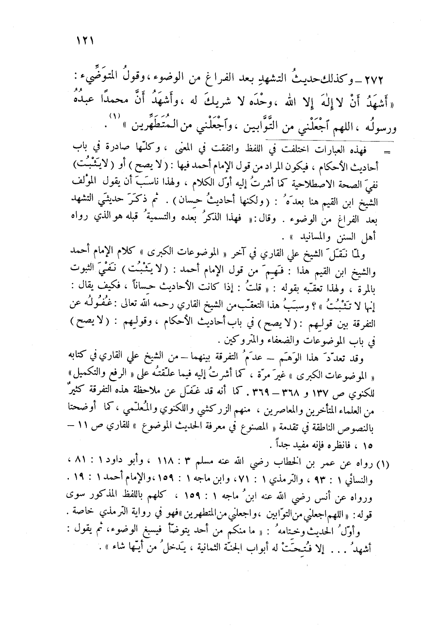 272- وَكَذَلِكَ حَدِيثُ التَّشَهُّدِ بَعْدَ الْفَرَاغِ مِنَ الْوُضُوءِ وقول المتوضيء: "أَشْهَدُ أَنَّ لا إِلَهَ إِلا اللَّهُ وَحْدَهُ لا شَرِيكَ لَهُ وَأَشْهَدُ أَنَّ مُحَمَّدًا عَبْدُهُ وَرَسُولُهُ اللَّهُمَّ اجْعَلْنِي مِنَ التَّوَّابِينَ وَاجْعَلْنِي مِنَ الْمُتَطَهِّرِينَ.