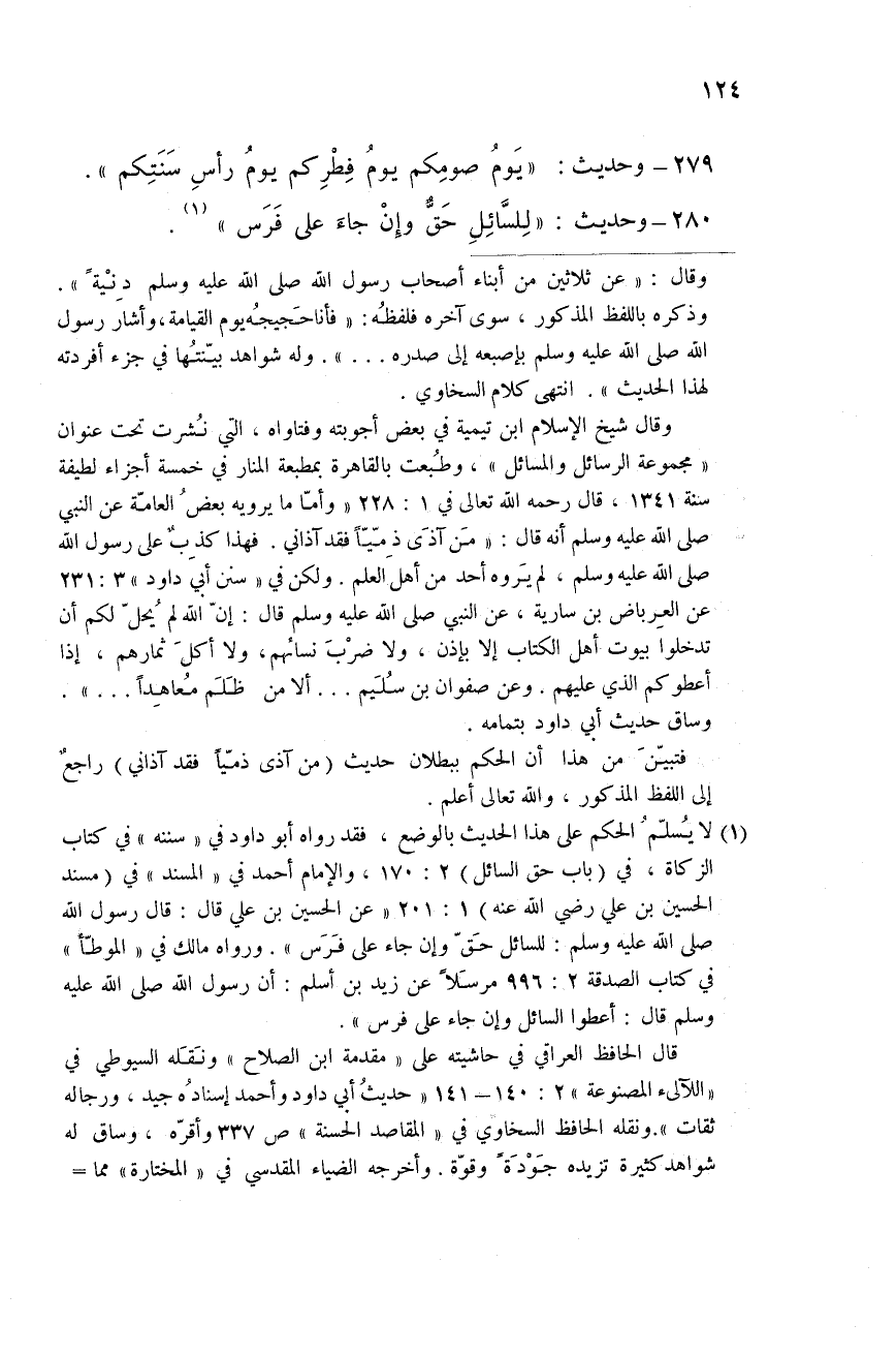 280- وَحَدِيثُ "وَلِلسَّائِلِ حَقٌّ وَإِنْ جَاءَ عَلَى فَرَسٍ"
