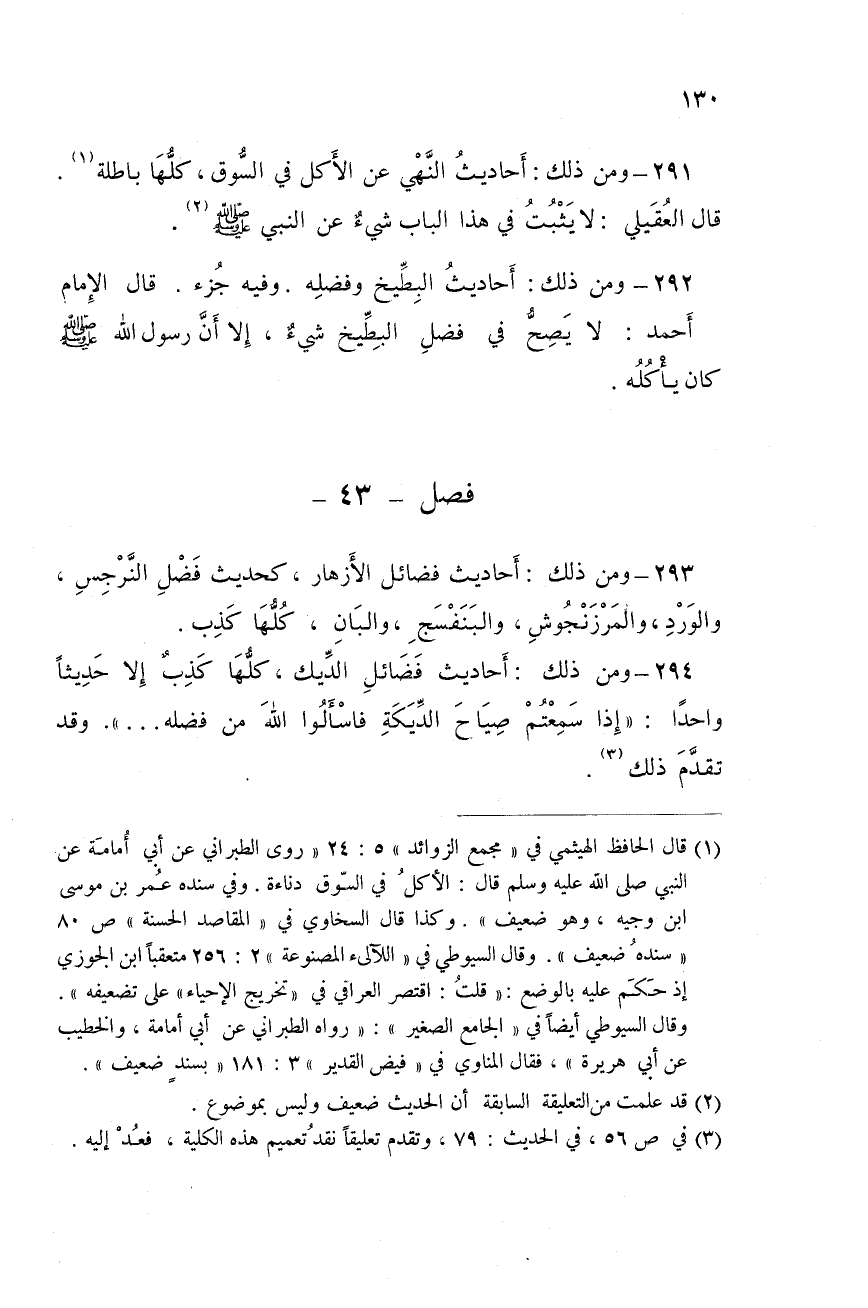 291- وَمِنْ ذَلِكَ أَحَادِيثُ النَّهْيُ عَنْ الأَكْلِ فِي السوق كلها باطلة قَالَ الْعُقَيْلِيُّ: "لا يَثْبُتُ فِي هَذَا الْبَابِ شَيْءٌ عَنِ النَّبِيِّ صَلَّى اللَّهُ عَلَيْهِ وَسَلَّمَ".