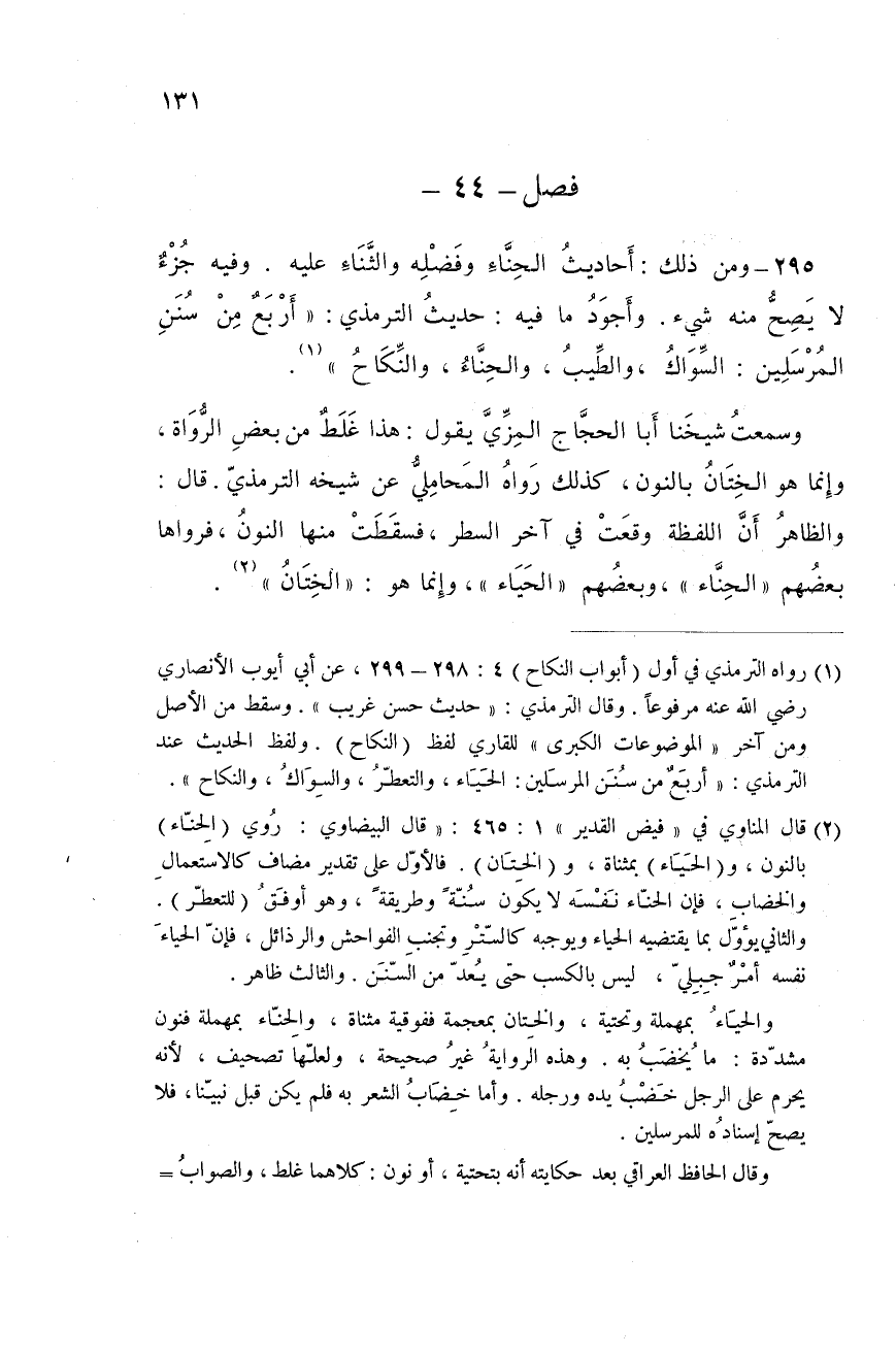 295- وَمِنْ ذَلِكَ أَحَادِيثُ الْحِنَّاءِ وَفَضْلِهِ وَالثَّنَاءِ عَلَيْهِ وَفِيهِ جُزْءٌ لا يَصِحُّ مِنْهُ شَيْءٌ وَأَجْوَدُ مَا فِيهِ حَدِيثُ التِّرْمِذِيِّ "أَرْبَعٌ مِنْ سُنَنِ الْمُرْسَلِينَ السِّوَاكُ وَالطِّيبُ وَالْحِنَّاءُ وَالنِّكَاحُ".
