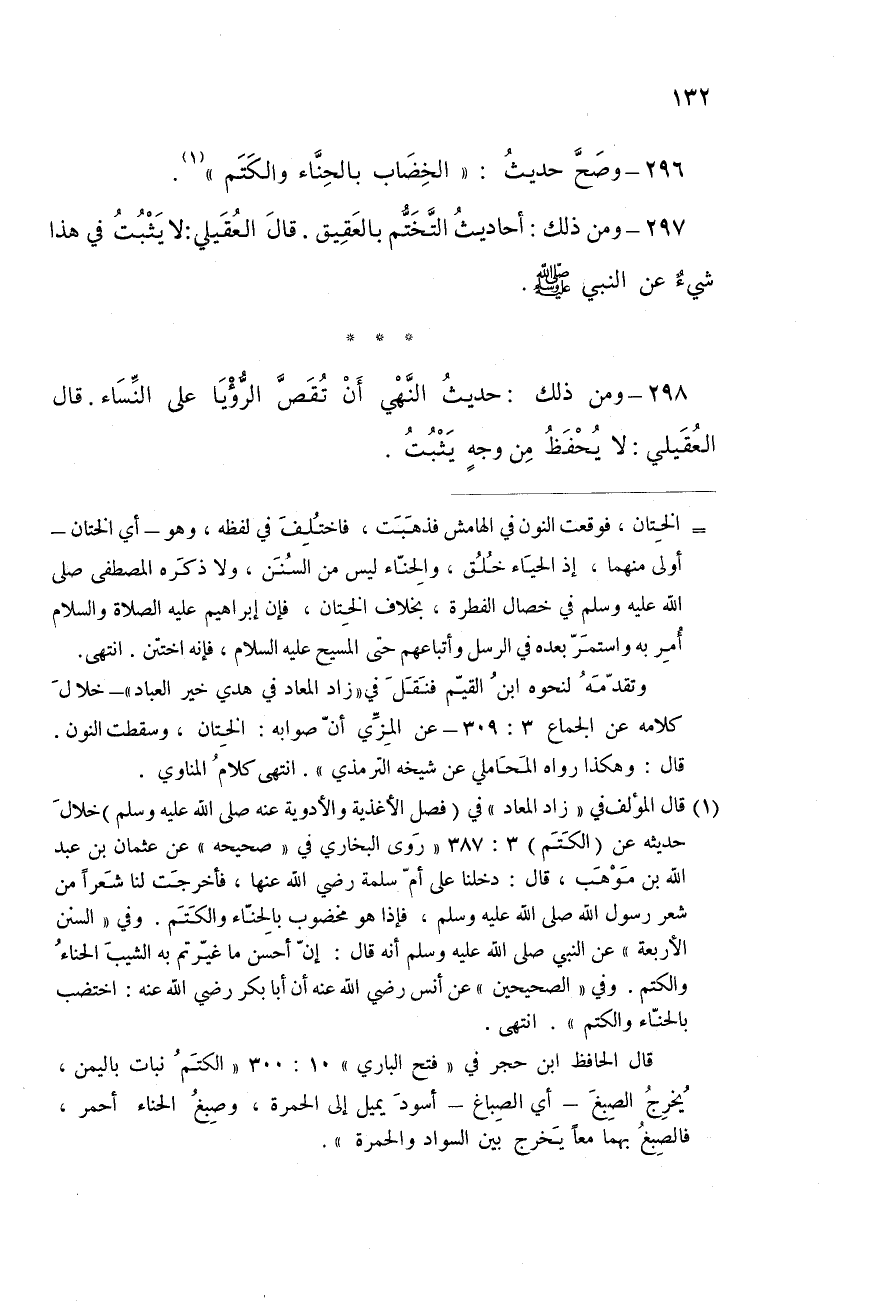 297- وَمِنْ ذَلِكَ أَحَادِيثُ التَّخَتُّمُ بِالْعَقِيقِ قَالَ الْعُقَيْلِيُّ: "لا يَثْبُتُ فِي هَذَا شَيْءٌ عَنِ النَّبِيِّ صَلَّى اللَّهُ عَلَيْهِ وَسَلَّمَ".