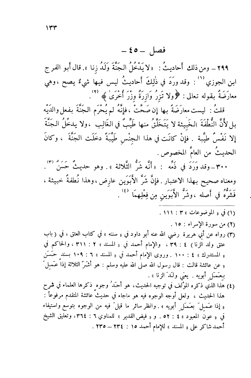 299- وَمِنْ ذَلِكَ أَحَادِيثُ "لا يَدْخُلُ الْجَنَّةَ وَلَدُ زِنَا" قَالَ أبو الفرج ابن الجوزي: "وقد وَرَدَ فِي ذَلِكَ أَحَادِيثُ لَيْسَ فِيهَا شَيْءٌ يَصِحُّ وَهِيَ مُعَارَضَةٌ بِقَوْلِهِ تَعَالَى: {وَلا تَزِرُ وَازِرَةٌ وِزْرَ أُخْرَى} ".