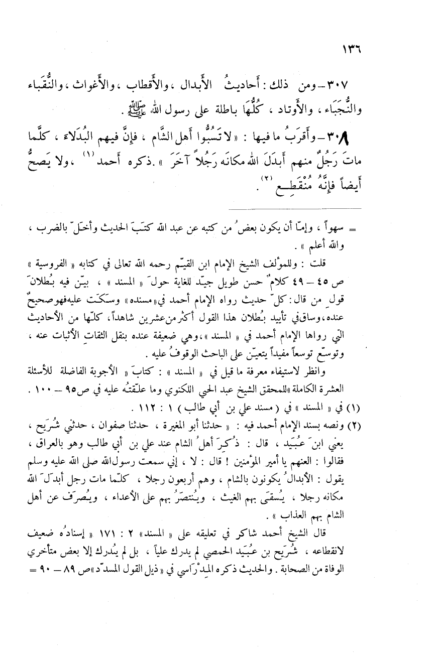 308- وَأَقْرَبُ مَا فِيهَا "لا تَسُبُّوا أَهْلَ الشَّامِ فَإِنَّ فِيهِمُ الْبُدَلاءَ كُلَّمَا مَاتَ رَجُلٌ مِنْهُمْ أَبْدَلَ اللَّهُ مَكَانَهُ رَجُلا آخَرَ" ذَكَرَهُ أَحْمَدُ وَلا يَصِحُّ أَيْضًا فَإِنَّهُ مُنْقَطِعٌ.
