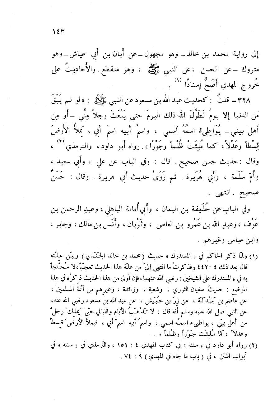328- قُلْتُ كَحَدِيثِ عَبْدِ اللَّهِ بْنِ مَسْعُودٍ عَنِ النَّبِيِّ صَلَّى اللَّهُ عَلَيْهِ وَسَلَّمَ: "لَوْ لَمْ يَبْقَ مِنَ الدُّنْيَا إِلا يَوْمٌ لَطَوَّلَ اللَّهُ ذَلِكَ اليوم حتى يبعث رجلا مني أو من أهل بيتي يواطىء اسْمُهُ اسْمِي وَاسْمُ أَبِيهِ اسْمُ أبي يَمْلأُ الأَرْضَ قَسْطًا وَعَدْلا كَمَا مُلِئَتْ ظُلْمًا وَجُورًا" رَوَاهُ أَبُو دَاوُدَ وَالتِّرْمِذِيُّ. وَقَالَ: "حَدِيثٌ حَسِنٌ صَحِيحٌ" قَالَ: "وَفِي الْبَابِ عَنْ عَلِيٍّ وَأَبِي سَعِيدٍ وَأُمِّ سَلَمَةَ وأبي هريرة ثم روى حديث أبي هُرَيْرَةَ وَقَالَ: "حَسِنٌ صَحِيحٌ" انْتَهَى.