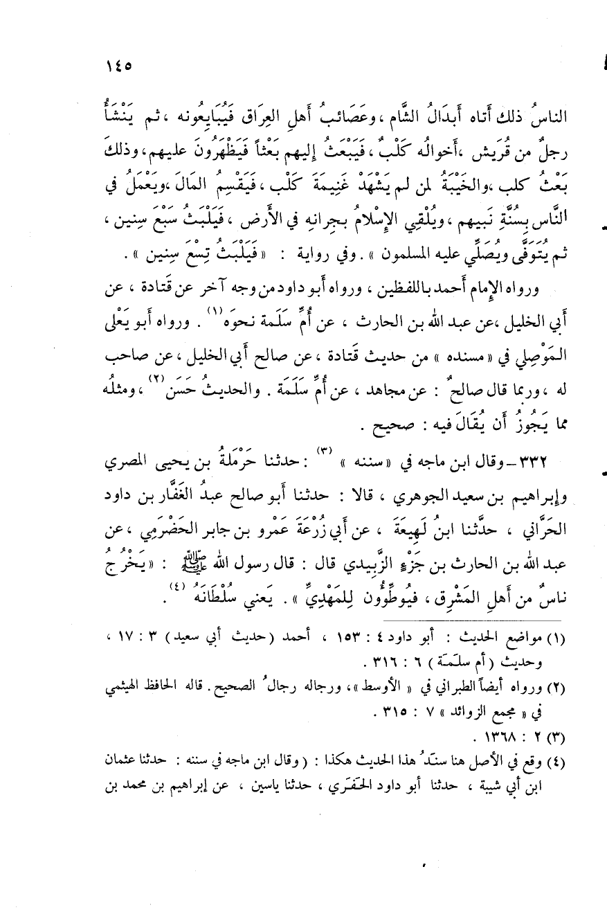 النَّاسُ ذَلِكَ أَتَاهُ أَبْدَالُ الشَّامِ وَعَصَائِبُ أَهْلِ الْعِرَاقِ فَيُبَايِعُونَهُ ثُمَّ يَنْشَأُ رَجُلٌ مِنْ قُرَيشٍ أَخْوَالَهُ كَلْبٌ فَيَبْعَثُ إِلَيْهِمْ بَعْثًا فَيَظْهَرُونَ عَلَيْهِمْ وَذَلِكَ بَعْثُ كَلْبٍ وَالْخَيْبَةُ لِمَنْ لَمْ يَشْهَدْ غَنِيمَةَ كَلْبٍ فَيُقَسِّمُ الْمَالَ وَيَعْمَلُ فِي النَّاسِ بسنة نبيهم ويلقي الإسلام بجرانه فِي الأَرْضِ فَيَلْبَثُ سَبْعَ سِنِينَ ثُمَّ يَتَوَفَّى وَيُصَلِّي عَلَيْهِ الْمُسْلِمُونَ وَفِي رِوَايَةٍ فَيَلْبَثُ تِسْعَ سِنِينَ ". وَرَوَاهُ الإِمَامُ أَحْمَدُ بِاللَّفْظَيْنِ وَرَوَاهُ أَبُو دَاوُدَ مِنْ وَجْهٍ آخَرَ عَنْ قَتَادَةَ عَنْ أَبِي الْخَلِيلِ عَنْ عَبْدِ اللَّهِ بْنِ الْحَارِثِ عَنْ أُمِّ سَلَمَةَ نَحْوِهِ وَرَوَاهُ أَبُو يَعْلَى الْمُوصِلِيُّ فِي مُسْنَدِهِ مِنْ حَدِيثِ قَتَادَةَ عَنْ صَالِحٍ أبي الْخَلِيلِ عَنْ صَاحِبٍ لَهُ وَرُبَّمَا قَالَ صَالِحٌ عَنْ مُجَاهِدٍ عَنْ أُمِّ سَلَمَةَ وَالْحَدِيثُ حَسِنٌ وَمِثْلُهُ مِمَّا يَجُوزُ أَنْ يُقَالَ فِيهِ: "صَحِيحٌ".