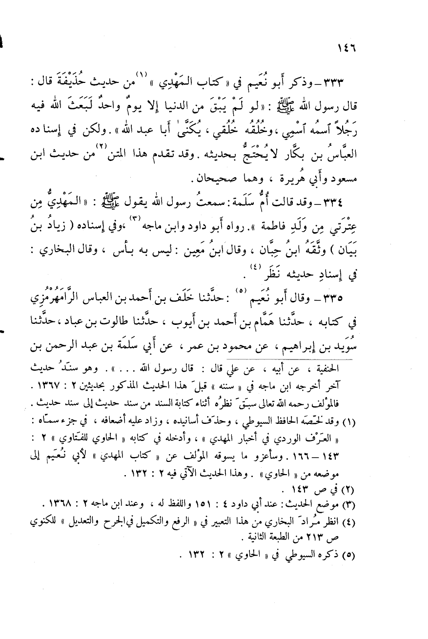 333- وَذَكَرَ أَبُو نُعَيْمٍ فِي كِتَابِ الْمَهْدِيِّ مِنْ حَدِيثِ حُذَيْفَةَ قَالَ قَالَ رَسُولُ اللَّهِ صَلَّى اللَّهُ عَلَيْهِ وَسَلَّمَ: "لَوْ لَمْ يَبْقَ مِنَ الدُّنْيَا إِلا يَوْمٌ وَاحِدٌ لَبَعَثَ اللَّهُ فِيهِ رَجُلا اسْمُهُ اسْمِي وَخَلْقُهُ خَلْقِي يُكْنَى أَبَا عبد الله" ولكن فِي إِسْنَادِهِ الْعَبَّاسُ بْنُ بَكَّارٍ لا يُحْتَجُّ بِحَدِيثِهِ وَقَدْ تَقَدَّمَ هَذَا الْمَتْنُ مِنْ حَدِيثِ ابْنِ مَسْعُودٍ وَأَبِي هُرَيْرَةَ وَهُمَا صَحِيحَانِ.