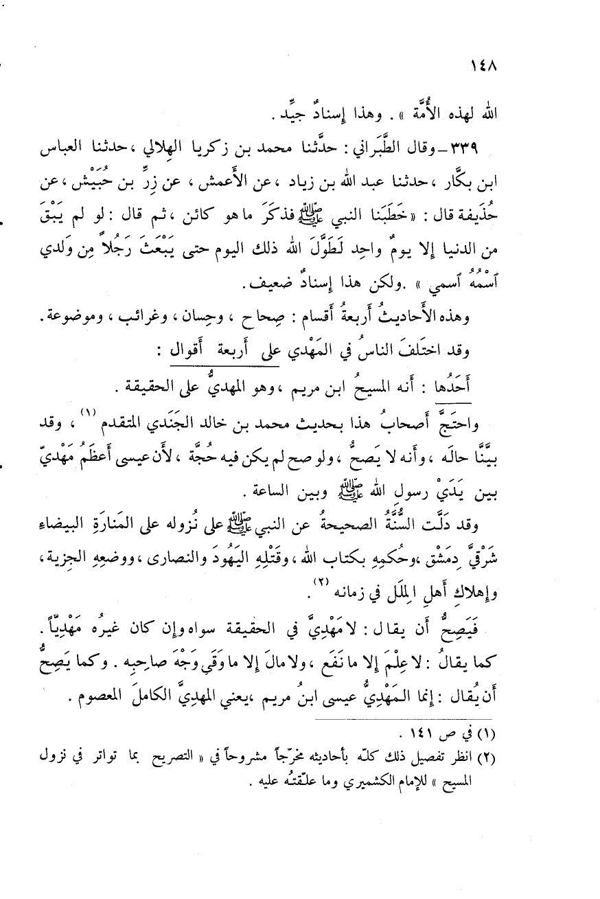 وَهَذِهِ الأَحَادِيثُ أَرْبَعَةُ أَقْسَامٍ صِحَاحٌ وَحِسَانٌ وَغَرَائِبُ وَمَوْضُوعَةٌ وَقَدِ اخْتَلَفَ النَّاسُ فِي المهدي على أربعة أقوال:
