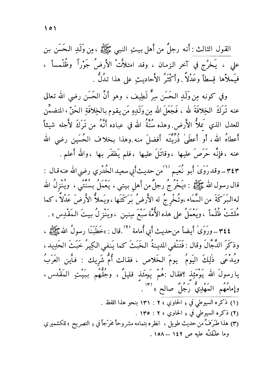 343- وَقَدْ رَوَى أَبُو نُعَيْمٍ مِنْ حَدِيثِ أَبِي سَعِيدٍ الْخُدْرِيِّ رَضِيَ اللَّهُ عَنْهُ قَالَ قَالَ رَسُولُ اللَّهِ صَلَّى اللَّهُ عَلَيْهِ وَسَلَّمَ: "يَخْرُجُ رَجُلٌ مِنْ أَهْلِ بَيْتِي يَعْمَلُ بِسُنَّتِي وَيُنْزِلُ اللَّهُ لَهُ الْبَرَكَةَ مِنَ السَّمَاءِ وَتُخْرِجُ لَهُ الأَرْضُ بَرَكَتَهَا وَيَمْلأُ الأَرْضَ عَدْلا كَمَا مُلِئَتْ ظُلْمًا وَيَعْمَلُ عَلَى هَذِهِ الأُمَّةِ سَبْعَ سِنِينَ وَيَنْزِلُ بَيْتَ الْمَقْدِسِ".