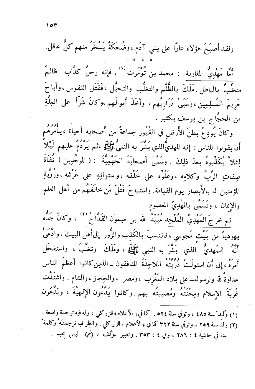 وَكَانَ يُوَدِّعُ بَطْنَ الأَرْضِ فِي الْقُبُورِ جَمَاعَةً مِنْ أَصْحَابِهِ أَحْيَاءً يأمرهم أَنْ يَقُولُوا لِلنَّاسِ إِنَّهُ الْمَهْدِيُّ الَّذِي بَشَّرَ بِهِ النَّبِيُّ صَلَّى اللَّهُ عَلَيْهِ وَسَلَّمَ ثُمَّ يَرْدِمُ عَلَيْهِمْ لَيْلا لِئَلا يُكَذِّبُوهُ بَعْدَ ذَلِكَ وَسُمِّيَ أَصْحَابُهُ الْجَهْمِيَّةُ الْمُوَّحِدِينَ نُفَاةُ صِفَاتِ الرَّبِّ وَكَلامِهِ وَعُلُوِّهِ عَلَى خَلْقِهِ وَاسْتِوَائِهِ عَلَى عَرْشِهِ وَرُؤْيَةِ الْمُؤْمِنيِنَ لَهُ بِالأَبْصَارِ يَوْمَ الْقِيَامَةِ وَاسْتَبَاحَ قَتْلَ مَنْ خَالَفَهُمْ مِنْ أَهْلِ الْعِلْمِ وَالإِيمَانِ وَتَسَمَّى بِالْمَهْدِيِّ الْمَعْصُومِ.