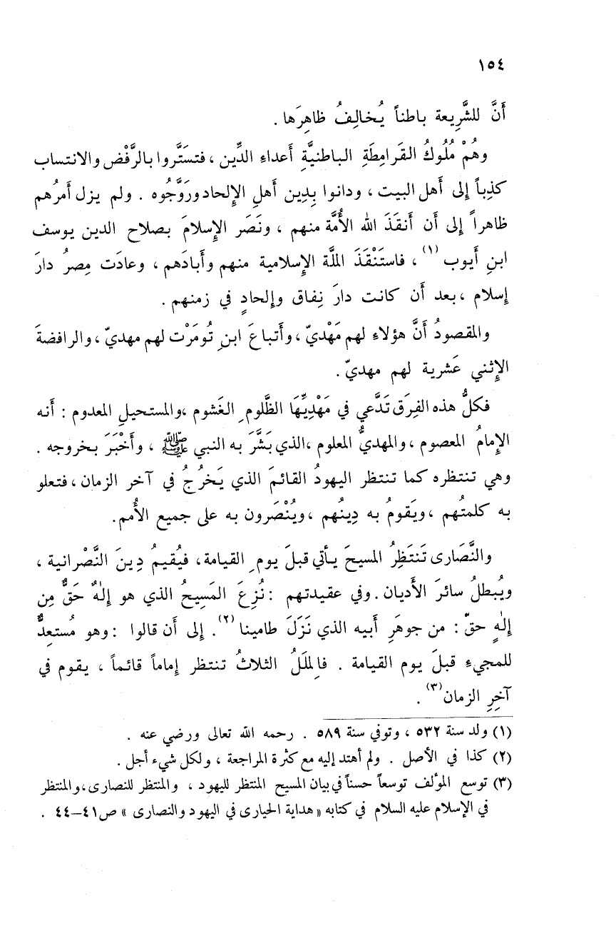 فَكُلُّ هَذِهِ الْفِرَقِ تَدَّعِي فِي مَهْدِيِّهَا الظَّلُومِ الْغَشُومِ وَالْمُسْتَحِيلِ الْمَعْدُومِ أَنَّهُ الإِمَامُ الْمَعْصُومُ وَالْمَهْدِيُّ الْمَعْلُومُ الَّذِي بَشَّرَ بِهِ النَّبِيُّ صَلَّى اللَّهُ عَلَيْهِ وَسَلَّمَ وَأَخْبَرَ بِخُرُوجِهِ وَهِيَ تَنْتَظِرَهُ كَمَا تَنْتَظِرُ الْيَهُودُ الْقَائِمُ الَّذِي يخرج في آخر الزمان فتعلو به كلمتهم ويقوم به دينهم وينصرون به على جميع الأمم.