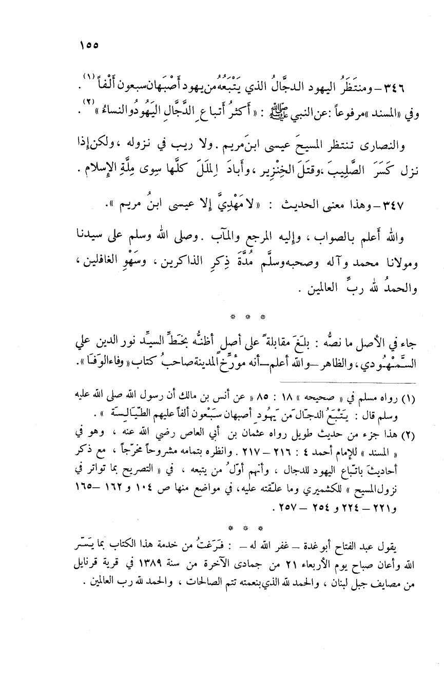 346- وَمُنْتَظَرُ الْيَهُودِ الدَّجَّالَ الَّذِي يَتْبَعَهُ مِنْ يَهُودِ أَصْبَهَانَ سَبْعُونَ أَلْفًا وَفِي الْمُسْنَدِ مَرْفُوعًا عَنِ النَّبِيِّ صَلَّى اللَّهُ عَلَيْهِ وَسَلَّمَ: "أَكْثَرُ أَتْبَاعِ الدَّجَّالِ الْيَهُودُ وَالنِّسَاءُ".