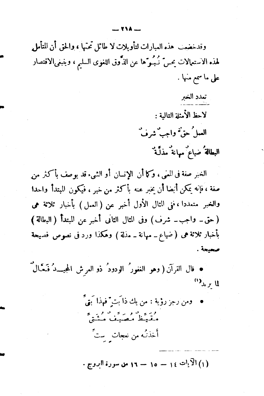 1 الشاهد في كلا الشطرين: إذ إن كلا من المبتدأ والخبر متعين، إذ هو مفهوم من سياق الكلام، والأصل "أكرمها ألأم الأحياء" و "وافيها أغدر الناس بالجيران" فقدم الخبر على المبتدأ، وهو لا بأس به ما دام مفهومًا.