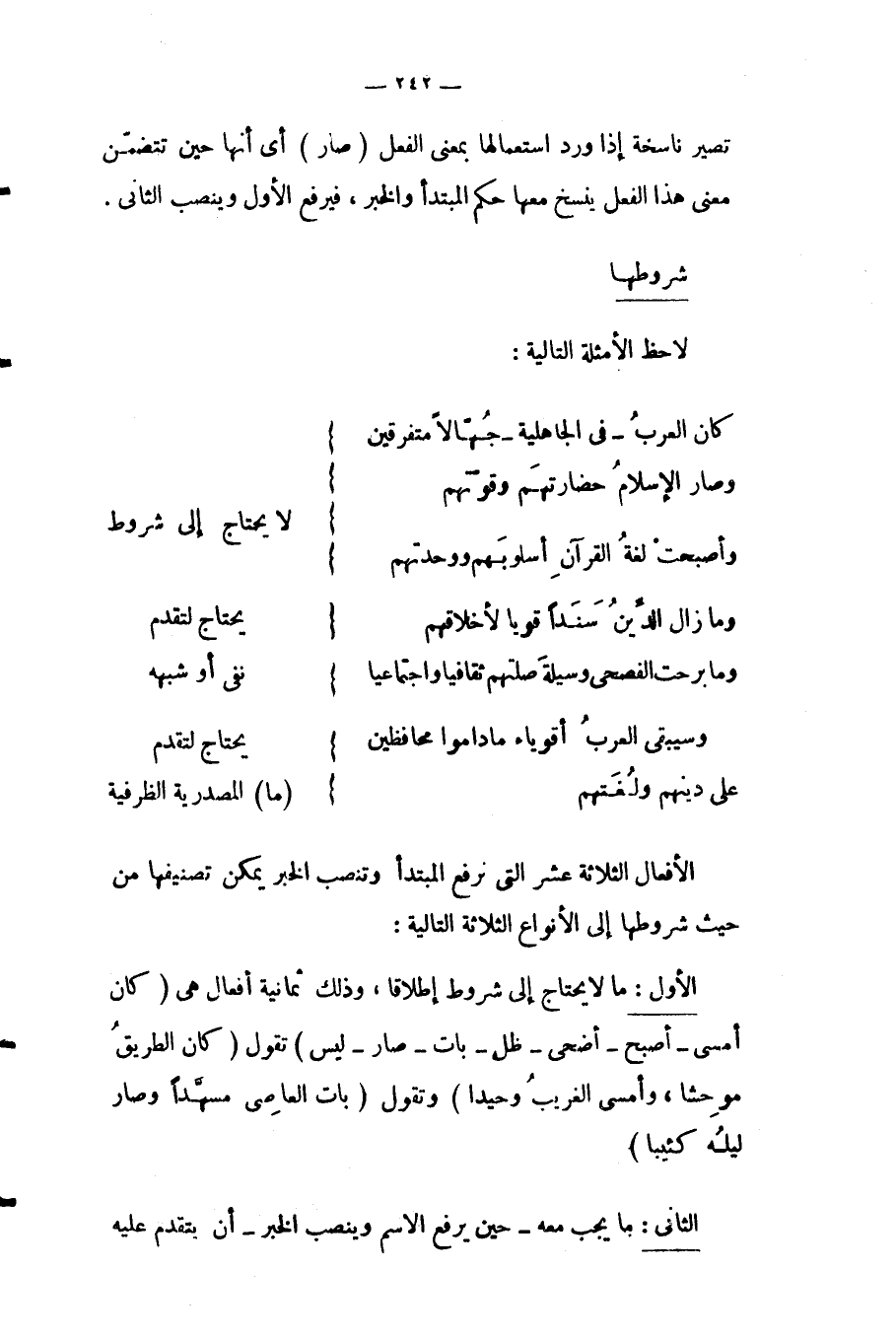 يلاحظ أن الأفعال "كان، صار، أصبح" في مجموعة الأمثلة الأولى احتاجت الجملة التي وردت فيها إلى اسم مرفوع بعدها، ثم إلى اسم منصوب ولم يتم معناها إلا بوجود هذا الأخير، وهو في الأمثلة السابقة "مغلوبا، أقوياء، غالبا" على التوالي.