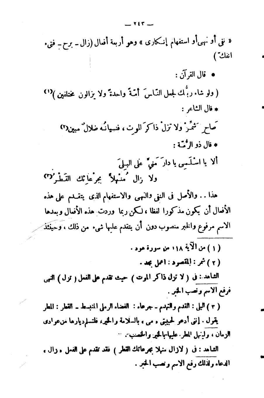معناه اكتفاء الفعل بالاسم المرفوع بعده فيتم المعنى تمامًا دون حاجة إلى المنصوب، وهذا المعنى التام يحدده الأسلوب الذي ورد فيه كقول القرآن: {فَسُبْحَانَ اللَّهِ حِينَ تُمْسُونَ وَحِينَ تُصْبِحُونَ} 1 وقوله: {خَالِدِينَ فِيهَا مَا دَامَتْ السَّمَوَاتُ وَالأَرْضُ} 2 وكما تردد العبارة "ما شاء الله كان وما لم يشأ لم يكن" وقول امرئ القيس: