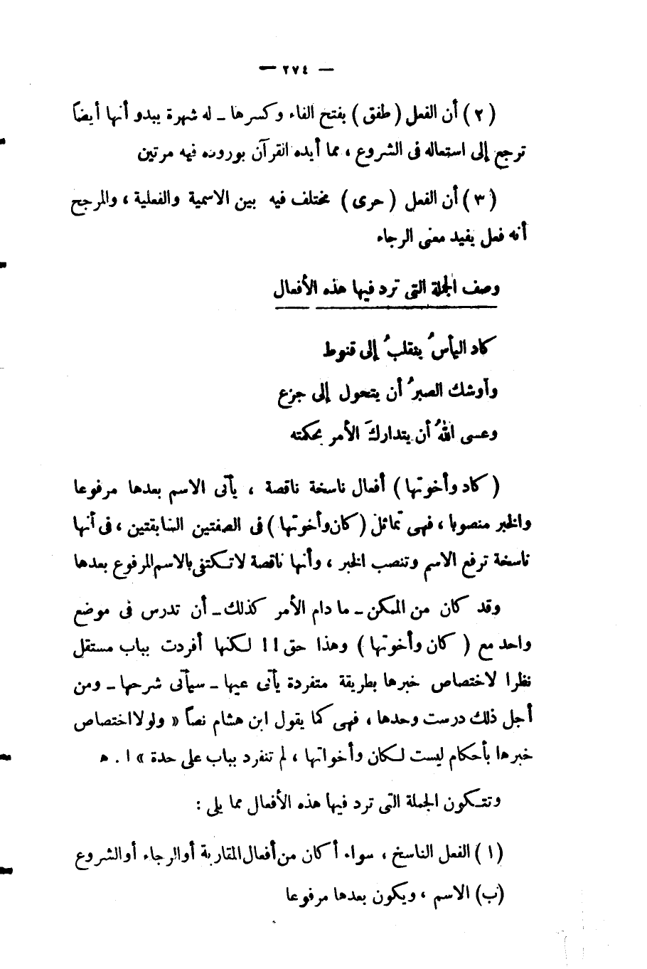 ب- يكون ناقصًا، واسمه ضمير مستتر و"الفعل" خبره في محل نصب وكلا هذين الاعتبارين مساوٍ للآخر في صناعة النحو
