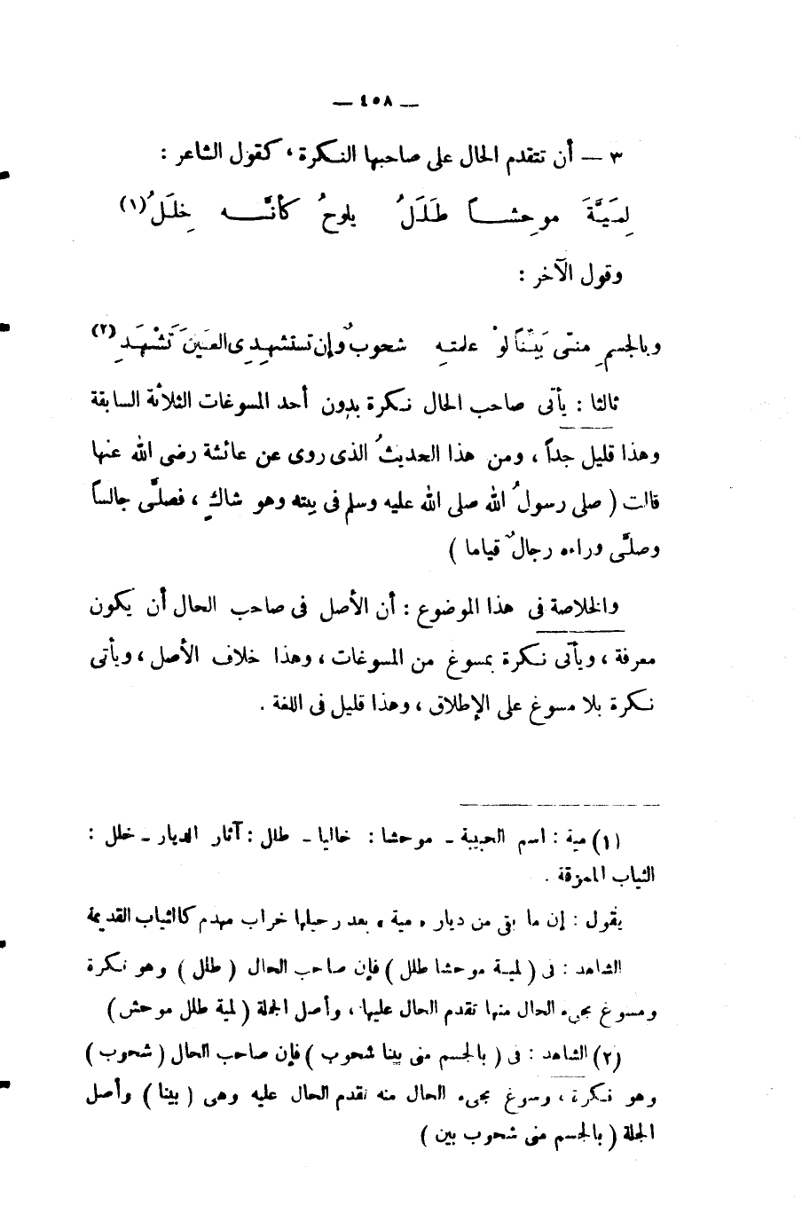 الشاهد: في البيت الأول: إذ تعددت الحال "رجلان حافيا" لواحد هو ياء المتكلم في قوله: "عَلَيّ".