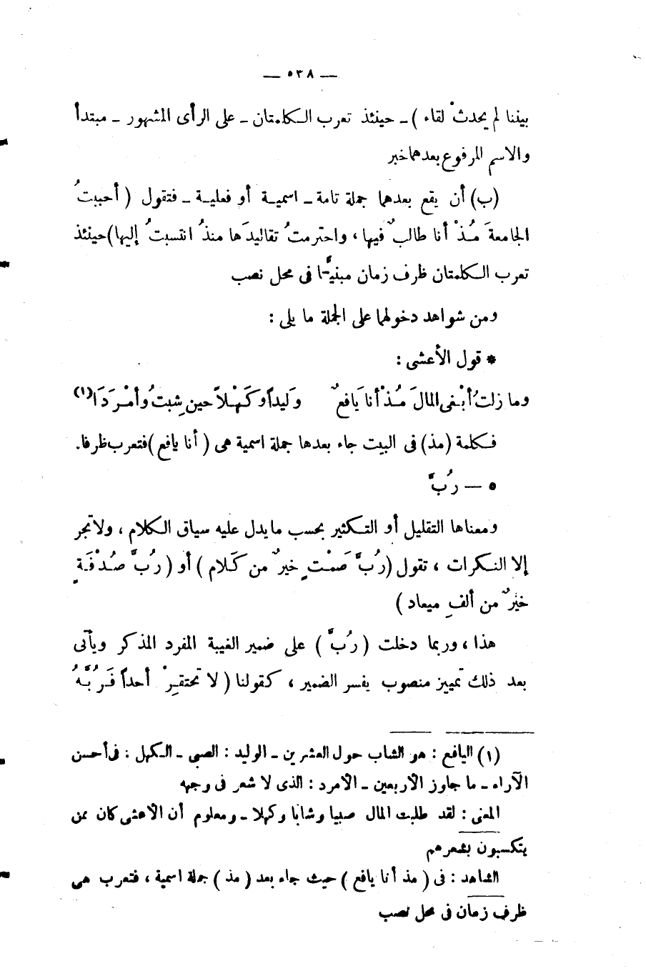 الثاني: أن كلا من المضاف والمضاف إليه يجب أن يكونا اسمين، فلا يكون أحدهما فعلا ولا حرفًا، ويستثنى من ذلك ما إذا جاء المضاف إليه جملة كاملة -وذلك مع كلمات قليلة ستأتي- حينئذٍ تكون الجملة كلها في محل جر لوقوعها موقع المفرد.