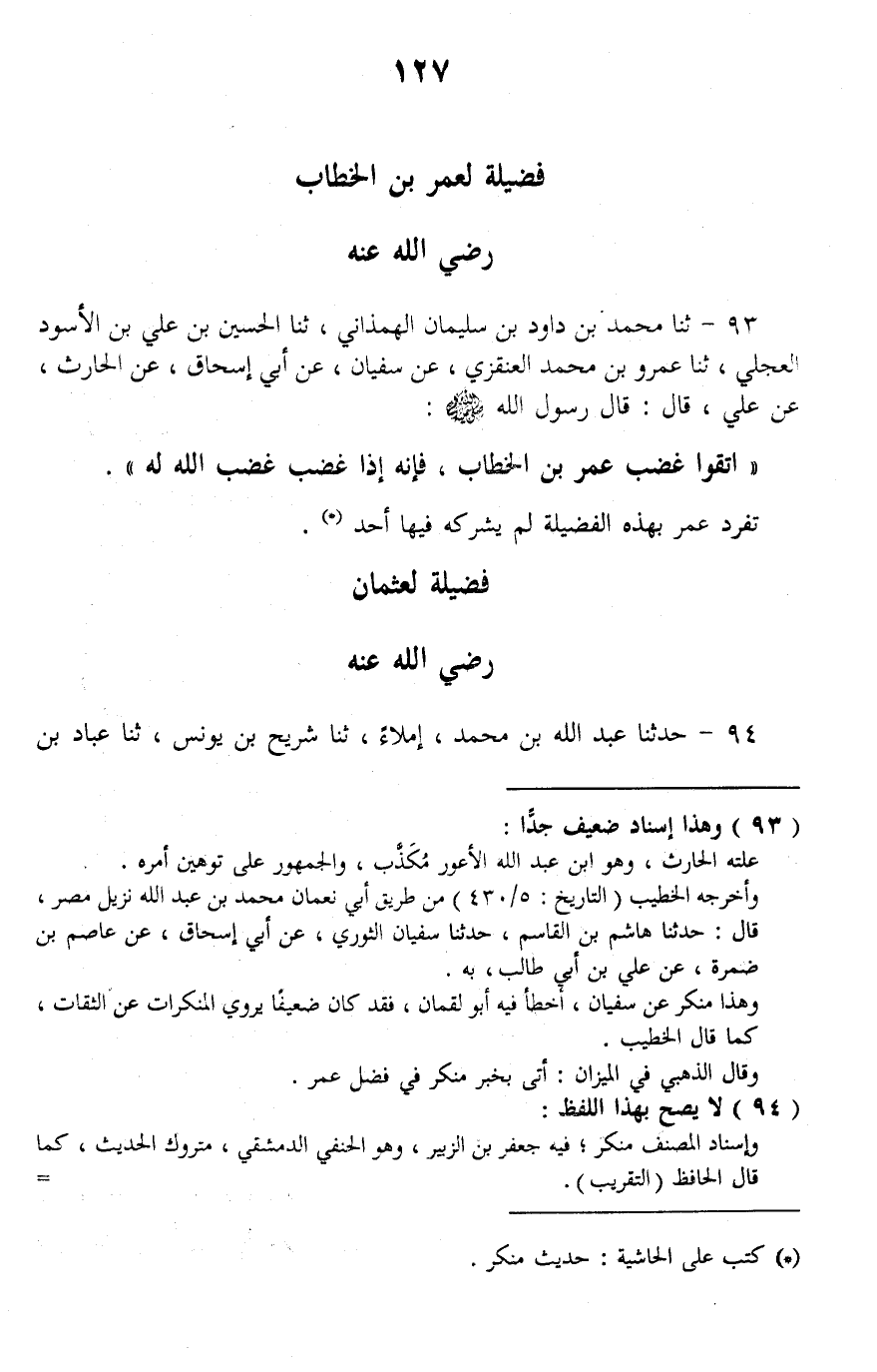 93 - ثنا مُحَمَّدُ بْنُ دَاوُدَ بْنِ سُلَيْمَانَ الْهَمَذَانِيُّ، ثنا الْحُسَيْنُ بْنُ عَلِيِّ بْنِ الْأَسْوَدِ الْعِجْلِيُّ، ثنا عَمْرُو بْنُ مُحَمَّدٍ الْعَنْقَزِيُّ، عَنْ سُفْيَانَ، عَنْ أَبِي إِسْحَاقَ، عَنِ الْحَارِثِ، عَنْ عَلِيٍّ، قَالَ: قَالَ رَسُولُ اللَّهِ صَلَّى اللهُ عَلَيْهِ وَسَلَّمَ: «§اتَّقُوا غَضَبَ عُمَرَ بْنِ الْخَطَّابِ، فَإِنَّهُ إِذَا غَضِبَ غَضِبَ اللَّهُ لَهُ» تَفَرَّدَ عُمَرُ بِهَذِهِ الْفَضِيلَةِ، لَمْ يَشْرَكْهُ فِيهَا أَحَدٌ