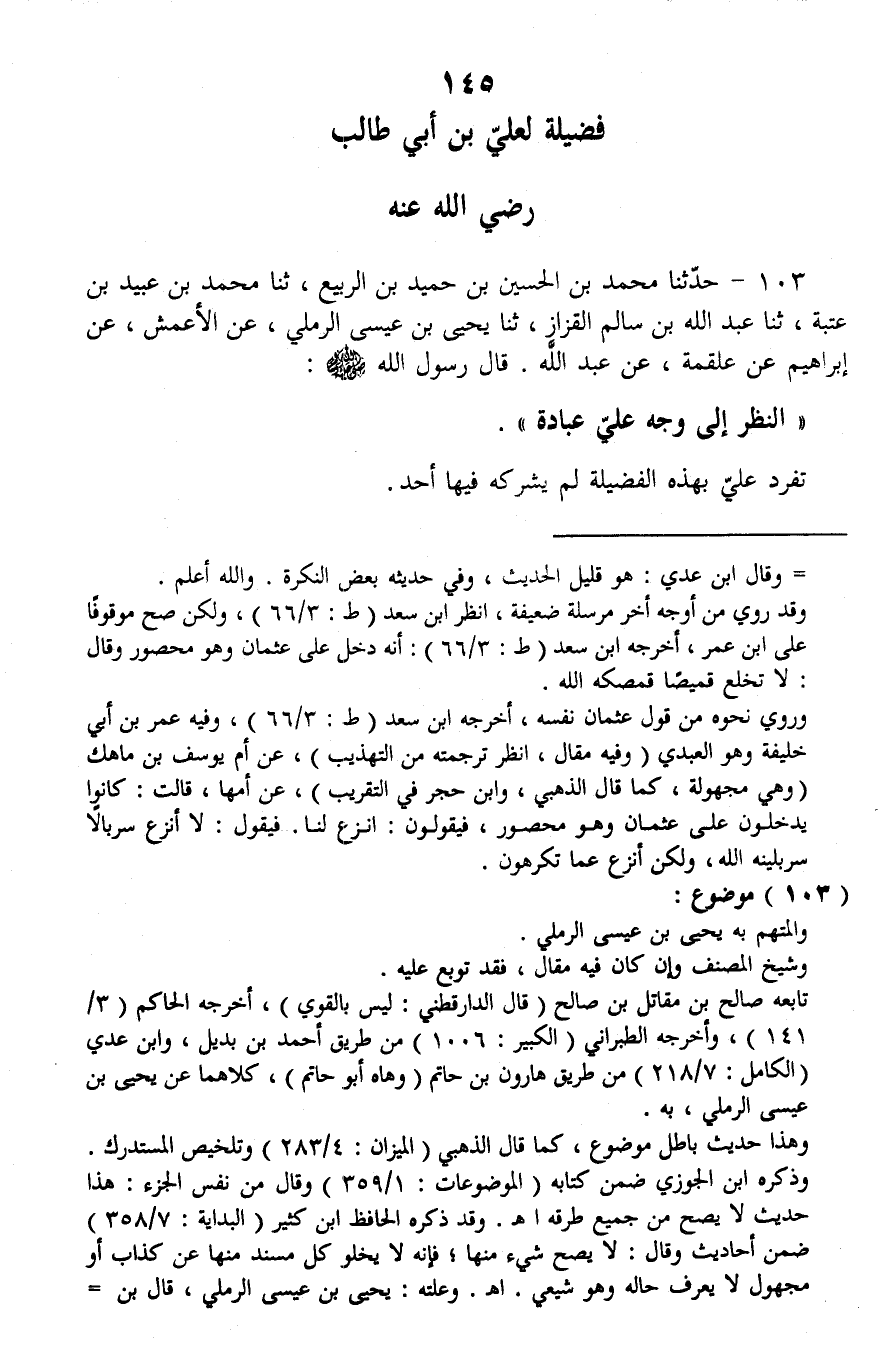 103 - حَدَّثَنَا مُحَمَّدُ بْنُ الْحُسَيْنِ بْنِ حُمَيْدِ بْنِ الرَّبِيعِ، ثنا مُحَمَّدُ بْنُ عُبَيْدِ بْنِ عُتْبَةَ، ثنا عَبْدُ اللَّهِ بْنُ سَالِمٍ الْقَزَّازُ، ثنا يَحْيَى بْنُ عِيسَى الرَّمْلِيُّ، عَنِ الْأَعْمَشِ، عَنْ إِبْرَاهِيمَ عَنِْ عَلْقَمَةَ، عَنْ عَبْدِ اللَّهِ، قَالَ رَسُولُ اللَّهِ صَلَّى اللهُ عَلَيْهِ وَسَلَّمَ: §«النَّظَرُ إِلَى وَجْهِ عَلِيٍّ عِبَادَةٌ» تَفَرَّدَ عَلِيٌّ بِهَذِهِ الْفَضِيلَةِ، لَمْ يَشْرَكْهُ فِيهَا أَحَدٌ